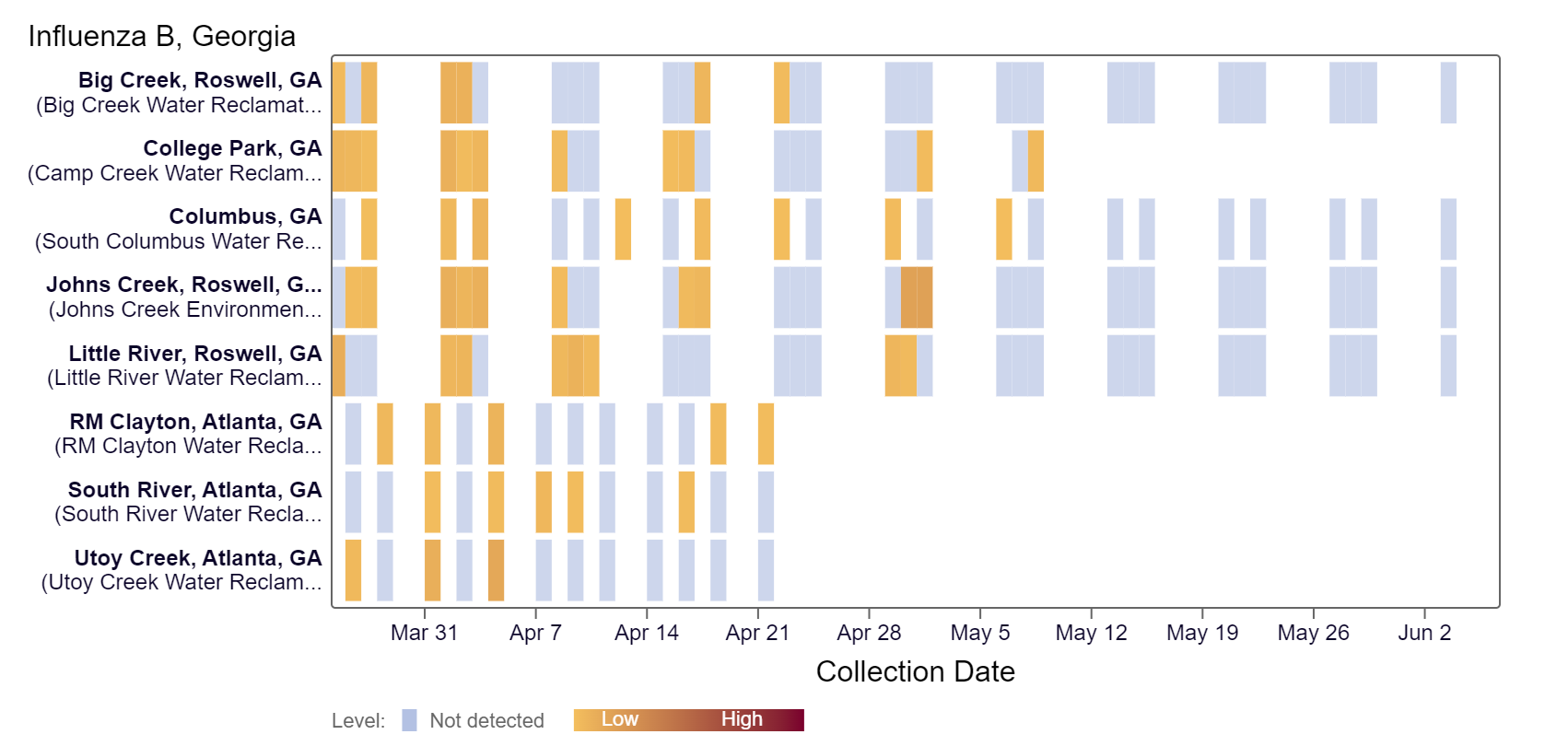 Influenza B (IBV) RNA has not been detected at any Georgia site within the last two weeks, according to the heat map below.