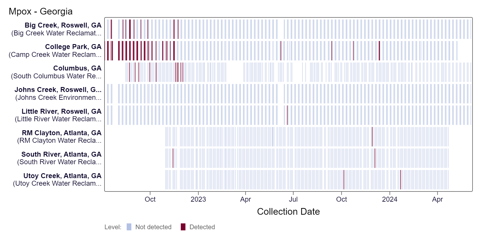 Mpox DNA results have been non-detect at all Georgia sites in the last 21 days. This heat map shows data since July 2022. Sites are labeled in the rows and each date a sample was collected as a column. The color blue means the sample was non-detect for mpox DNA and the color maroon means Mpox DNA was detected. White indicates no sample was collected. Johns Creek, Big Creek, Columbus, and Little River are in the LOW (4 sites) wastewater category as of 6/7/24. There was not enough data to calculate a category for College Park, Utoy Creek, South River, and RM Clayton.