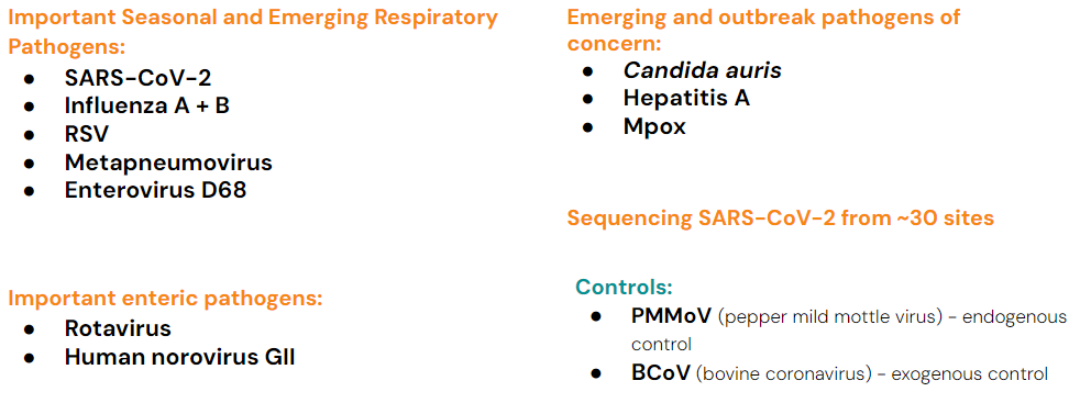 Currently monitoring a suite of Respiratory, Gastrointestinal and Outbreak Pathogens of Concern