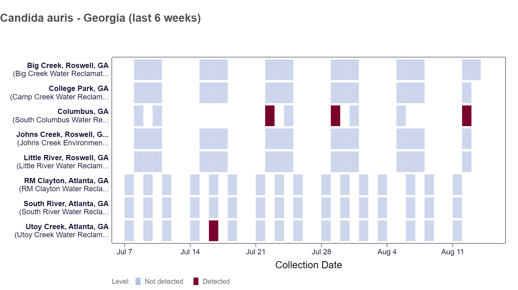 Candida auris DNA has been detected at the Columbus site in the last two weeks, based on the heat map below. As of 8/16/24, Columbus is in the MEDIUM (1 site) wastewater category. RM Clayton, South River, Utoy Creek, College Park, Big Creek, Johns Creek, and Little River are in the LOW (7 sites) wastewater category.