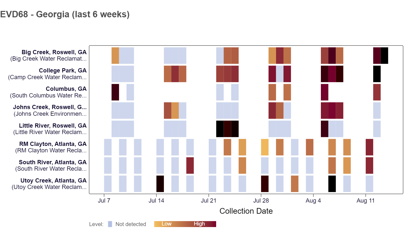 EV-D68 RNA concentrations are below 20,000 copies/g over the last two weeks. There continues to be detections at each of the 8 Georgia sites ranging from lower to higher concentrations, according to the heat map below. As a reminder, the color blue means the sample was non-detect for EV-D68 RNA and the colors get darker orange with higher concentrations. As of 8/16/24, RM Clayton, South River, College Park, Columbus, Big Creek, and Johns Creek are in the MEDIUM (6 sites) wastewater category. Utoy Creek and Little River are in the LOW (2 sites) category. This is consistent with higher levels of EV-D68 concentrations across the country.