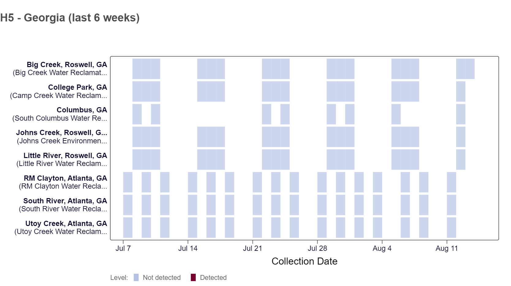 H5 marker in Influenza A (IAV) Below is a heat map showing the Georgia sites with samples collected and tested thus far. All results thus far have been non-detect at all Georgia sites based on available data. For more information about this testing and interpretation of results, see our FAQ sheet here.