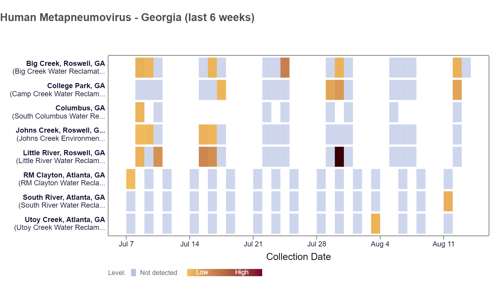 HMPV (human metapneumovirus) RNA was detected at Big Creek, College Park, South River, and Utoy Creek in the last two weeks, based on the heat map below. RM Clayton, South River, Utoy Creek, College Park, Columbus, Big Creek, Johns Creek, and Little River are in the LOW (8 sites) wastewater category, as of 8/16/24.
