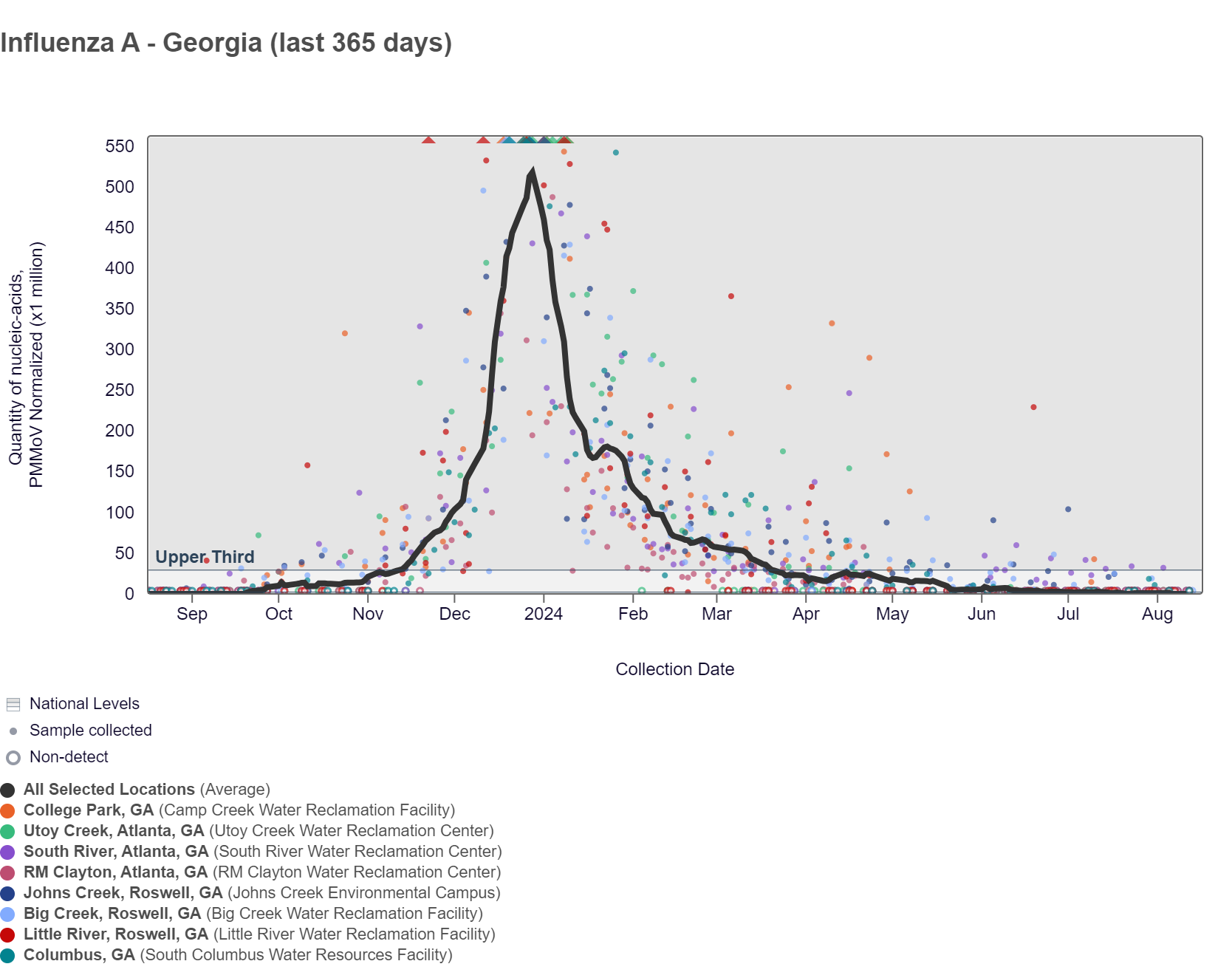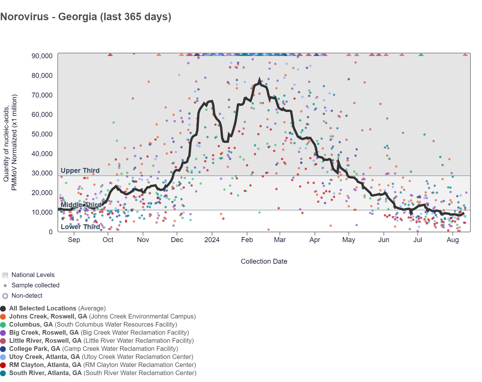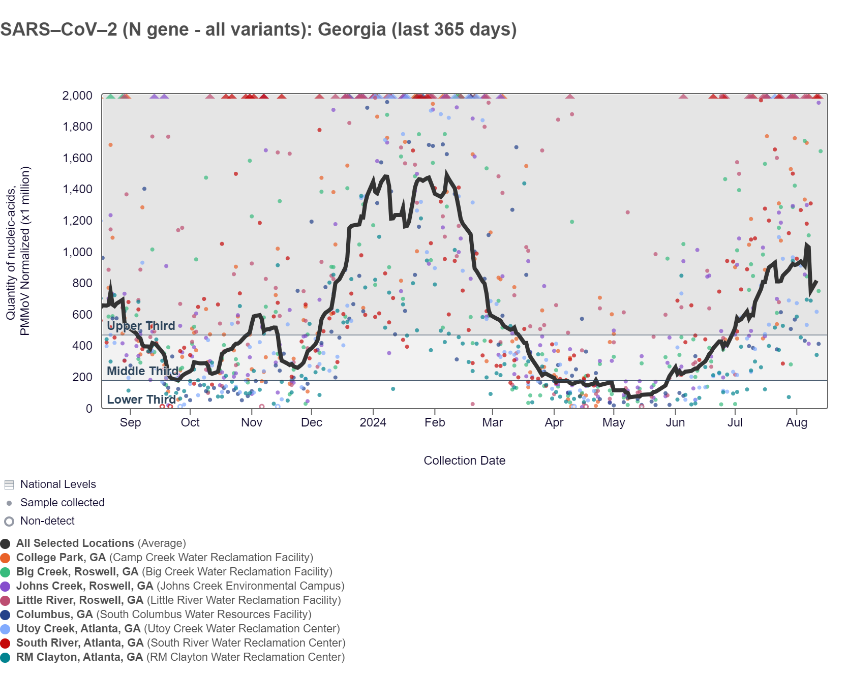 The chart below shows the raw data and the population-weighted aggregated trend line for all 8 Georgia sites when the data is normalized by PMMoV is at the bottom of the middle third level. As of 8/16/24, RM Clayton, South River, Utoy Creek, College Park, Columbus, Big Creek, Johns Creek, and Little River are in the LOW (8 sites) wastewater category.