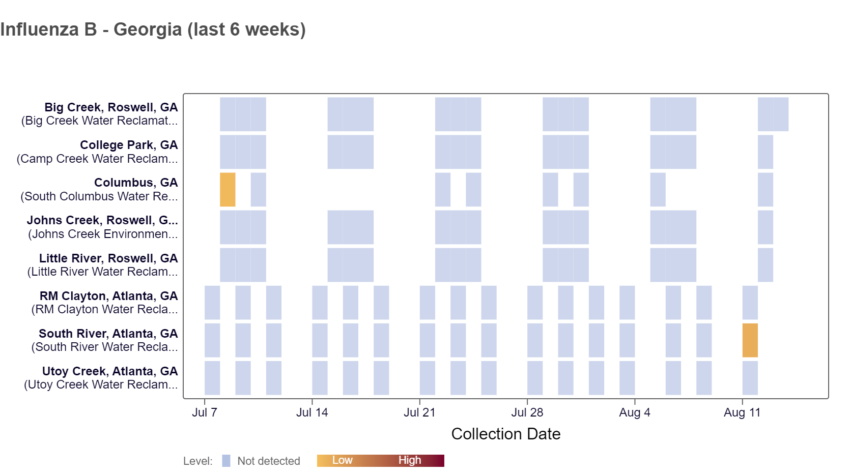 Influenza B (IBV) RNA has been non-detect at all Georgia sites within the last two weeks, according to the heat map below. As of 8/16/24, all Georgia WWSCAN sites are in the LOW (8 sites) wastewater category.