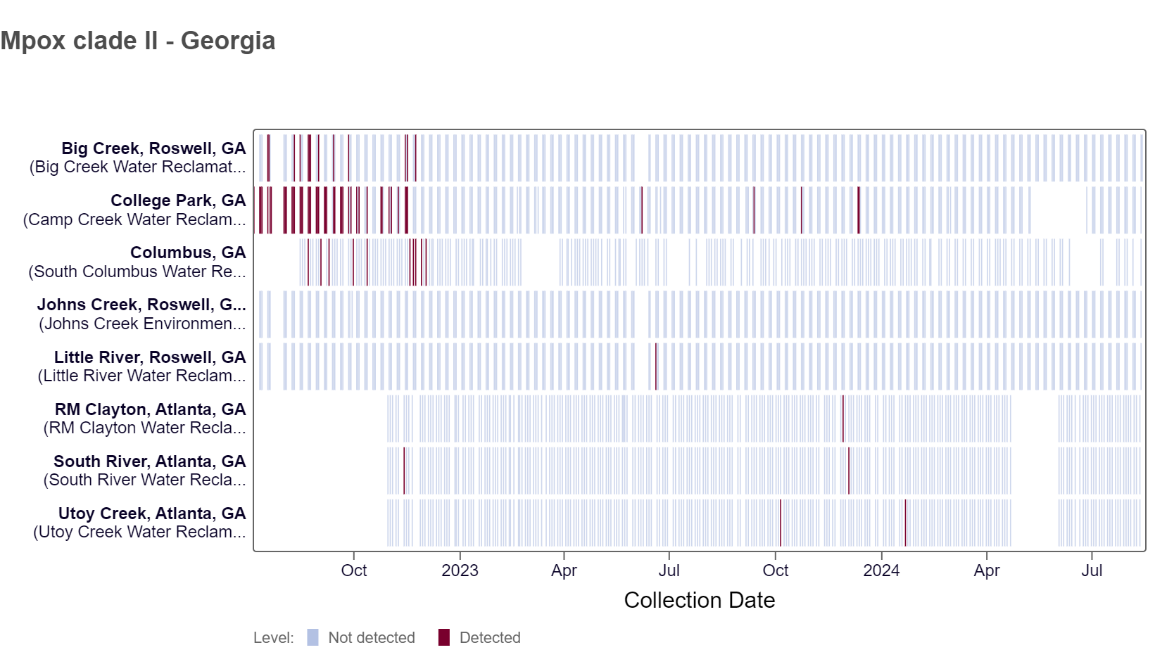 Mpox clade II DNA results have been non-detect at all Georgia sites in the last 21 days. This heat map shows data since July 2022. Sites are labeled in the rows and each date a sample was collected as a column. The color blue means the sample was non-detect for mpox DNA and the color maroon means Mpox DNA was detected. White indicates no sample was collected. RM Clayton, South River, Utoy Creek, College Park, Columbus, Big Creek, Johns Creek, and Little River are in the LOW (8 sites) wastewater category as of 8/16/24.