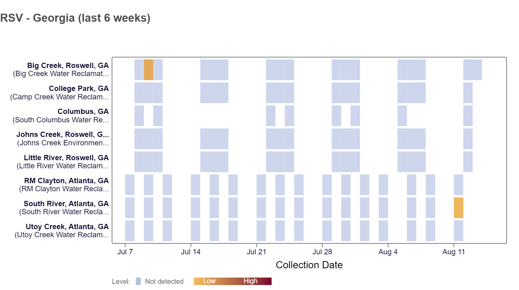 Respiratory syncytial virus (RSV) RNA was detected at the South River site over the last two weeks, according to the heat map below. As of 8/16/24, all Georgia WWSCAN sites are in the LOW (8 sites) wastewater category.