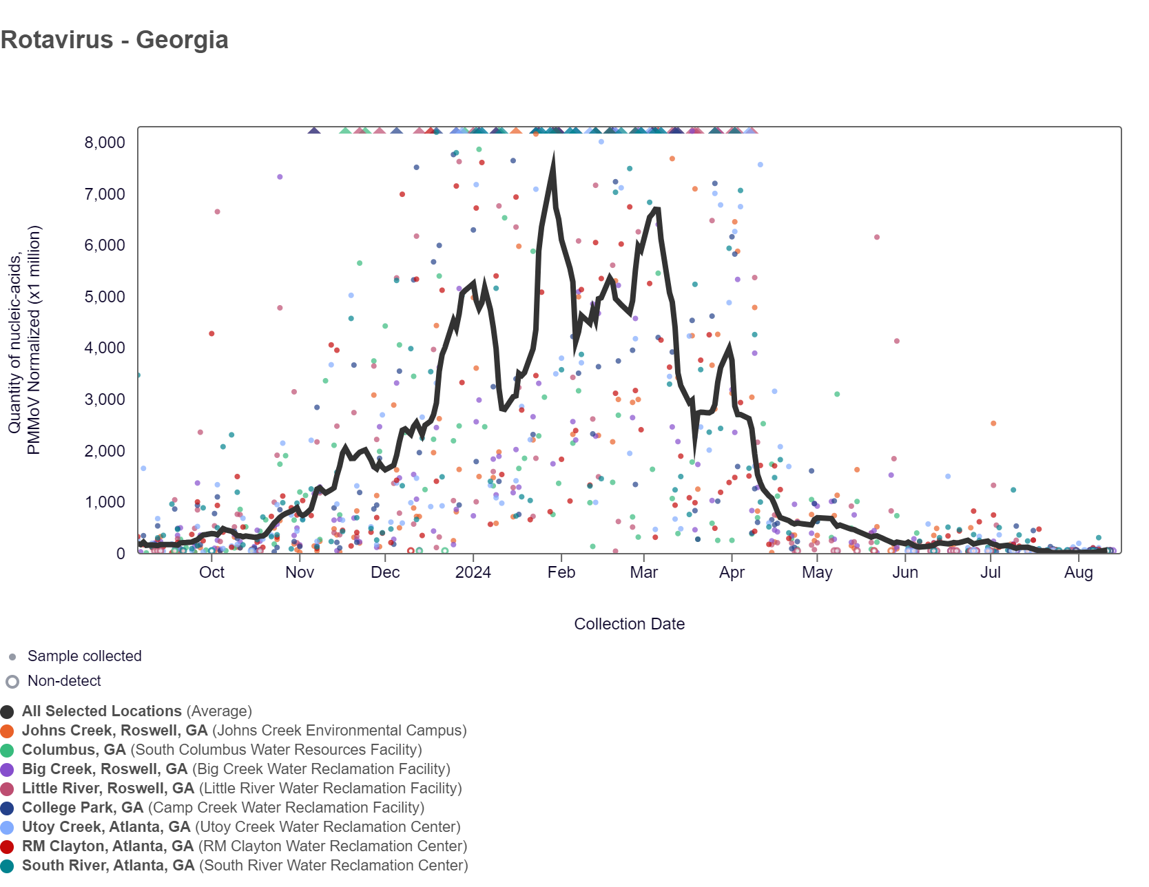 Rotavirus RNA concentrations have been below 30,000 copies/g over the last two weeks. The chart below shows data since September 2023, including the population-weighted average line is shown in black plus the raw data for each site. As of 8/16/24, Utoy Creek is in the MEDIUM (1 site) wastewater category. RM Clayton, South River, College Park, Columbus, Big Creek, Johns Creek, and Little River are in the LOW (7 sites) wastewater category.