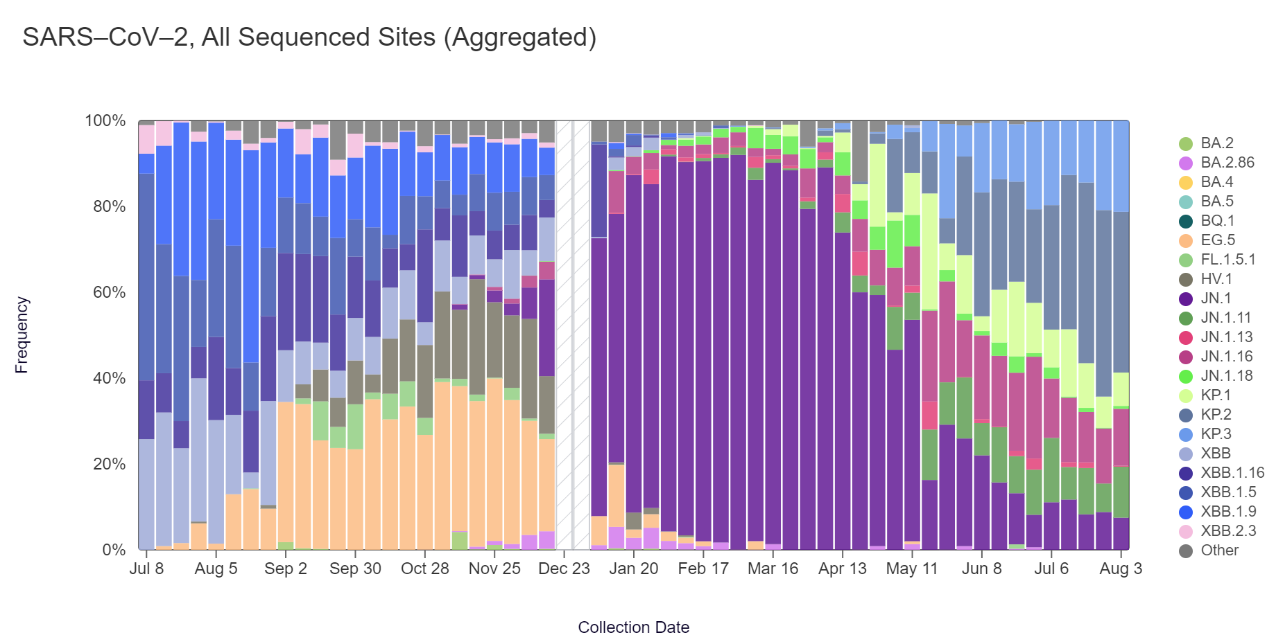 Sequencing data is now also available in aggregate across all sites in WWSCAN with sequencing data through Aug 3. That plot is shown below and suggests that KP.2 is the most abundant variant across all sites (37.4%).