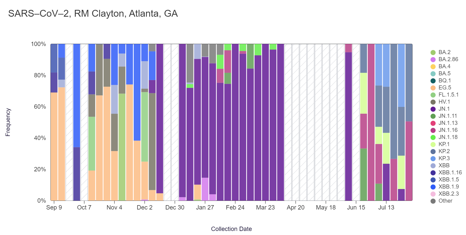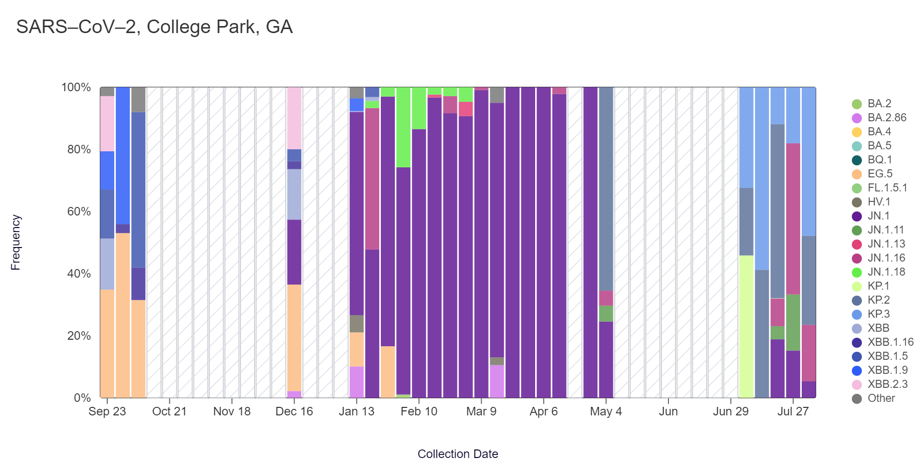 In the most recent samples, JN.1.16 (50.6%) and KP.2 (49.4%) made up the largest proportions of lineages detected at RM Clayton. KP.3 (47.8%) made up the largest proportion of lineages detected at College Park. Note that the most recent data is shown below & should be updated as more samples are analyzed (through Aug 3 at RM Clayton and College Park).