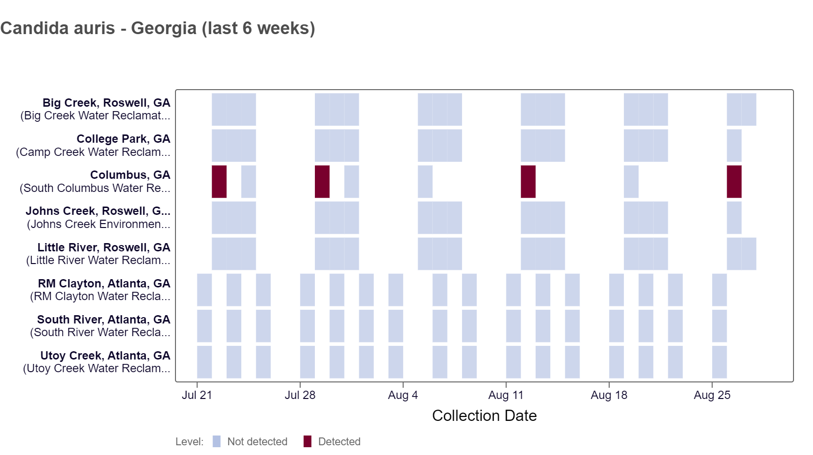 Candida auris DNA has been detected at the Columbus site in the last two weeks, based on the heat map below. As of 8/30/24, Columbus is in the MEDIUM (1 site) wastewater category. RM Clayton, South River, Utoy Creek, College Park, Big Creek, Johns Creek, and Little River are in the LOW (7 sites) wastewater category.