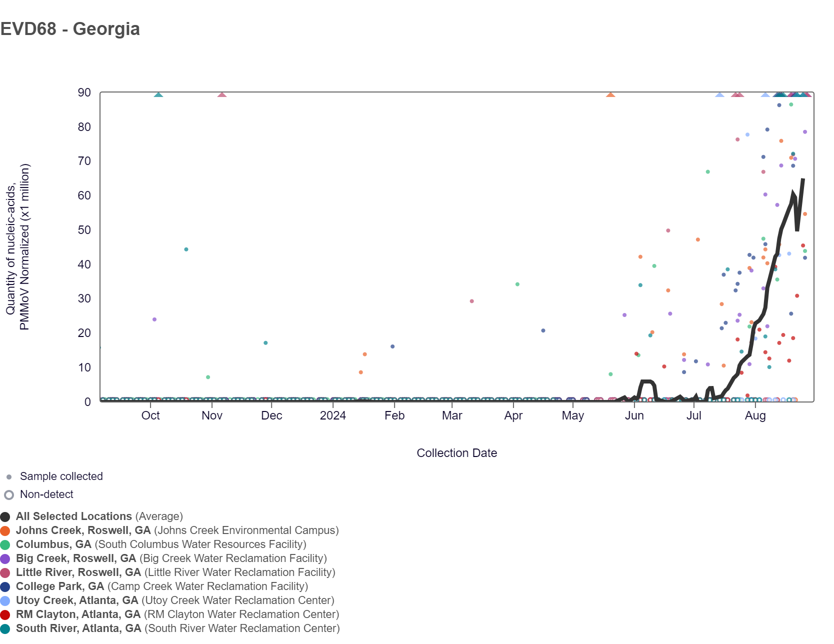 The chart below shows the raw data and the population-weighted aggregated trend line for all 8 Georgia sites when the data is normalized by PMMoV began to increase summer 2024, while national levels began to increase earlier this year. As of 8/30/24, all 8 Georgia WWSCAN sites are in the MEDIUM (8 sites) wastewater category.