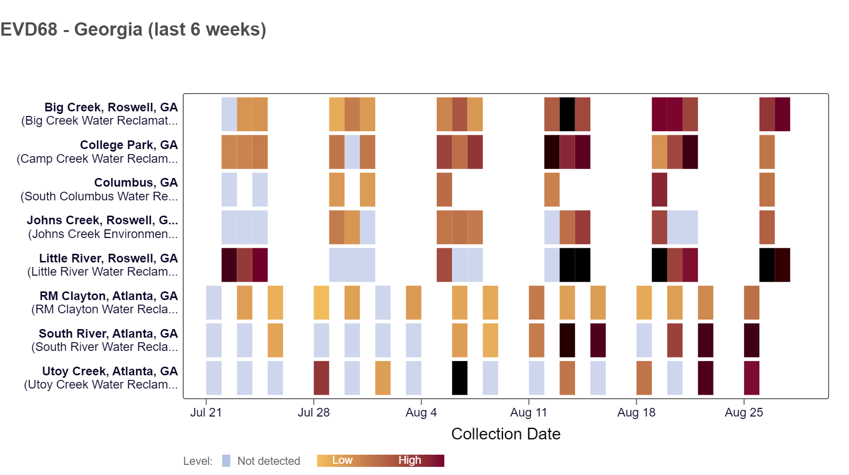 EV-D68 RNA concentrations are below 20,000 copies/g over the last two weeks. There are detections at all 8 Georgia WWSCAN sites ranging from lower to higher concentrations, according to the heat map below. As a reminder, the color blue means the sample was non-detect for EV-D68 RNA and the colors get darker orange with higher concentrations. As of 8/16/24, RM Clayton, South River, College Park, Columbus, Big Creek, and Johns Creek are in the MEDIUM (6 sites) wastewater category. Utoy Creek and Little River are in the LOW (2 sites) category.