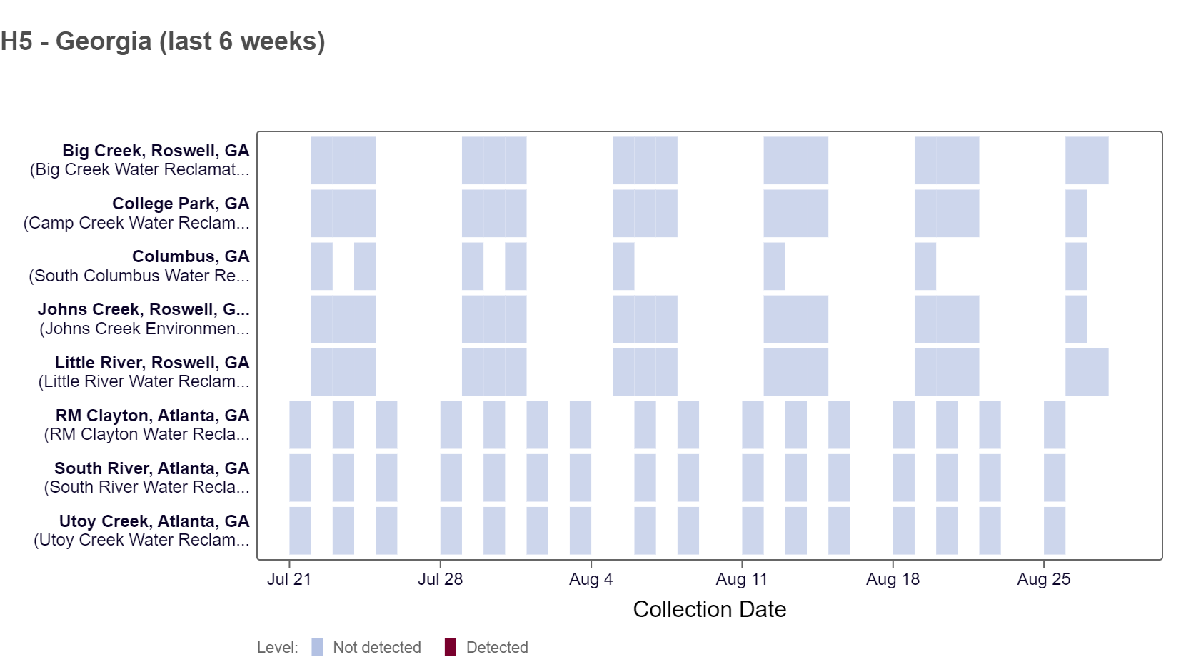 H5 marker in Influenza A (IAV) Below is a heat map showing the Georgia sites with samples collected and tested thus far. All results thus far have been non-detect at all Georgia sites based on available data. For more information about this testing and interpretation of results, see our FAQ sheet here.