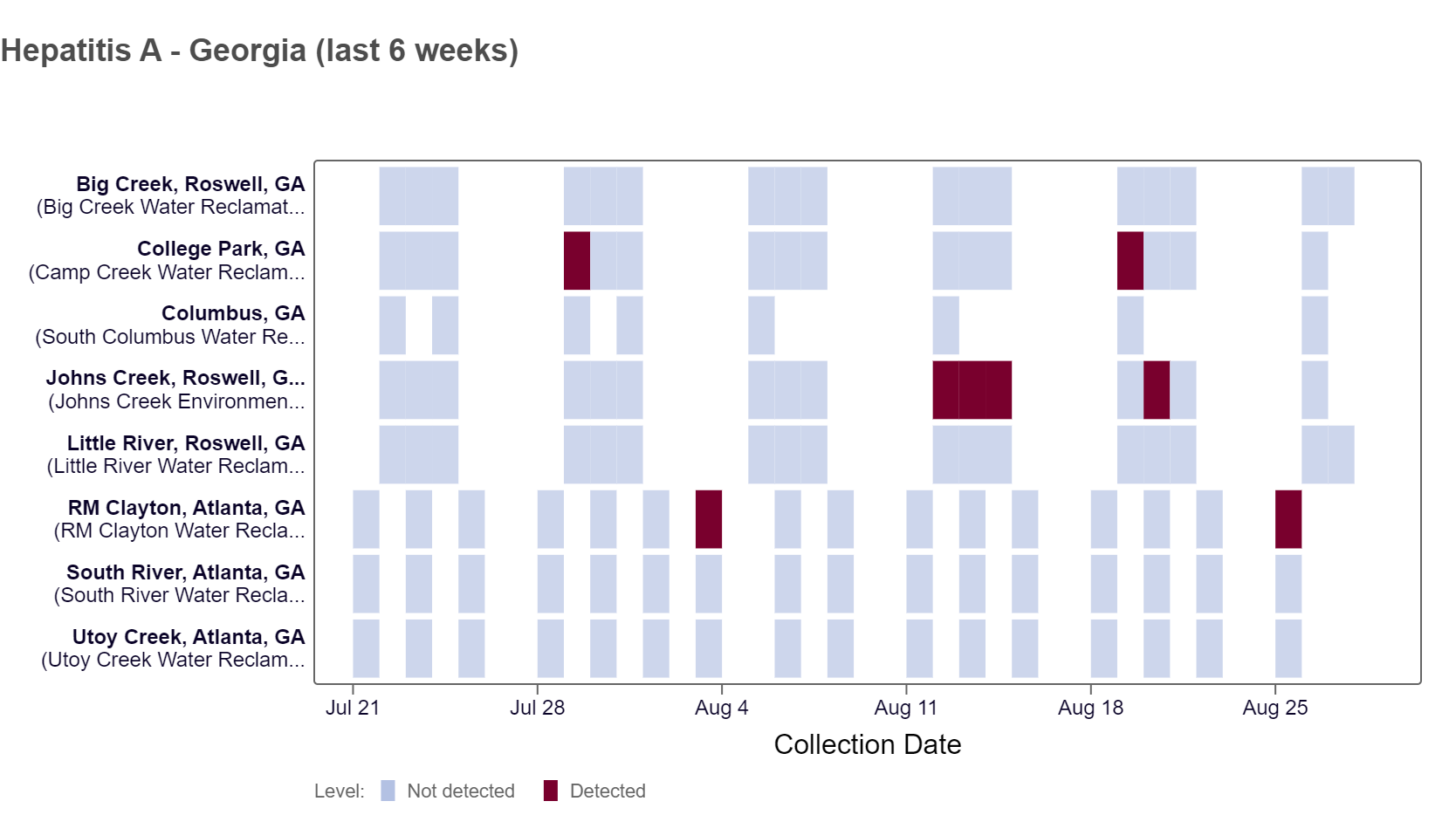Hepatitis A RNA was detected at the College Park, RM Clayton and Johns Creek sites over the last two weeks, according to the heat map. As of 8/30/24, all Georgia WWSCAN sites are in the LOW (8 sites) wastewater category.