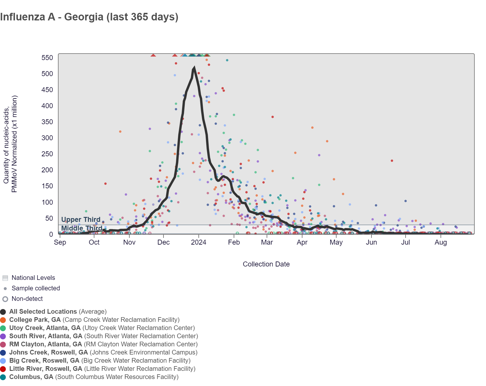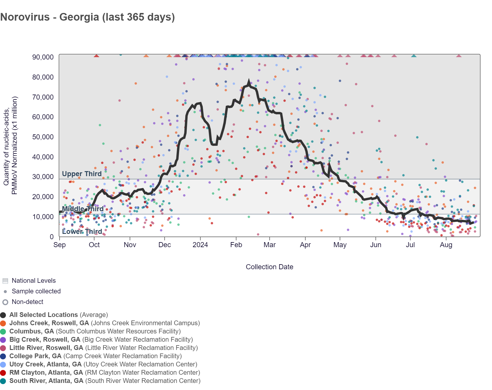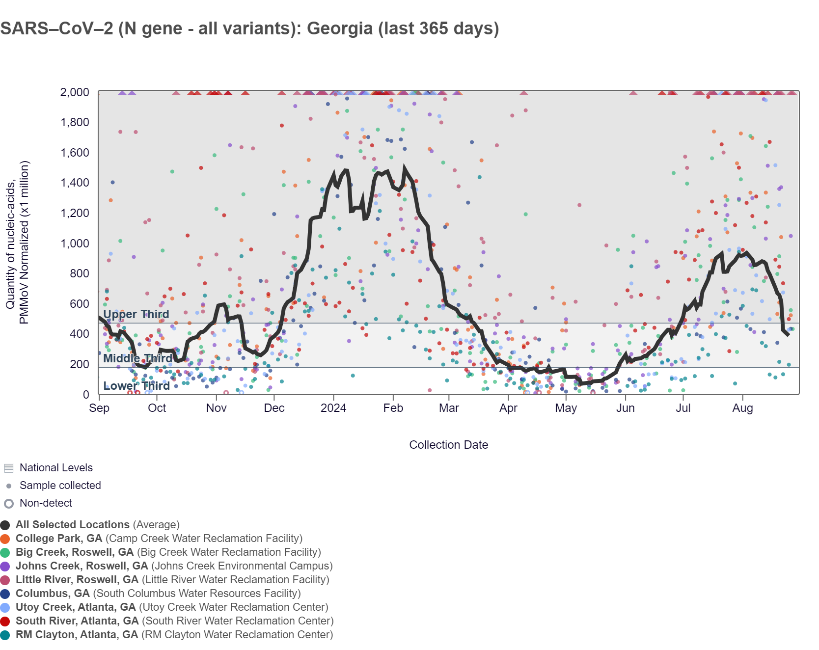 The chart below shows the raw data and the population-weighted aggregated trend line for all 8 Georgia sites when the data is normalized by PMMoV is at the bottom of the middle third level. As of 8/30/24, RM Clayton, South River, Utoy Creek, College Park, Columbus, Big Creek, Johns Creek, and Little River are in the LOW (8 sites) wastewater category.