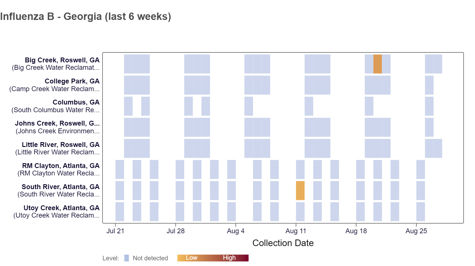 Influenza B (IBV) RNA has been detected at the Big Creek site in the last two weeks, according to the heat map below. As of 8/30/24, all Georgia WWSCAN sites are in the LOW (8 sites) wastewater category.