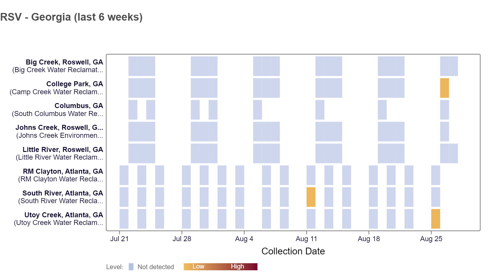 Respiratory syncytial virus (RSV) RNA was detected at the South River site over the last two weeks, according to the heat map below. As of 8/30/24, all Georgia WWSCAN sites are in the LOW (8 sites) wastewater category.