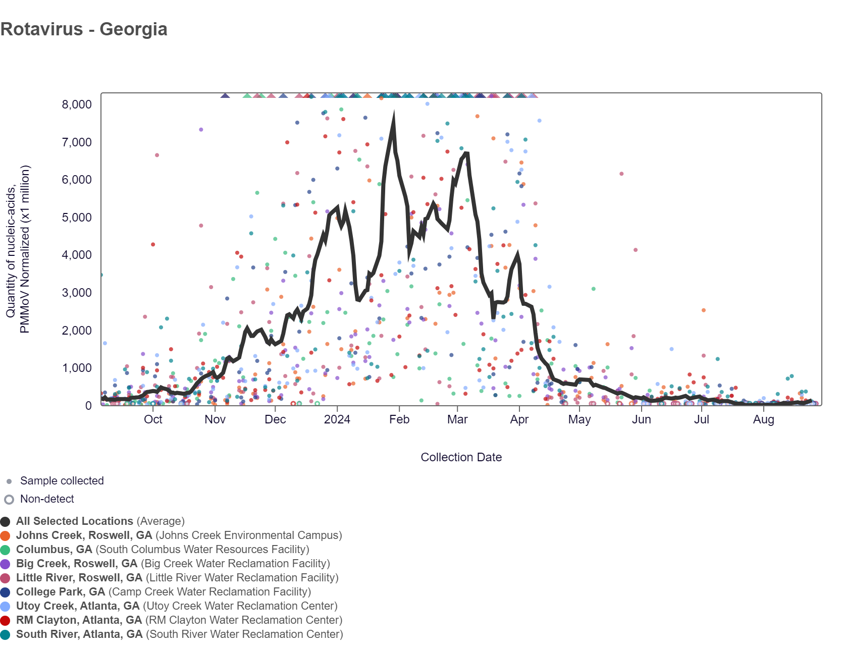 Rotavirus RNA concentrations have been below 87,000 copies/g over the last two weeks. The chart below shows data since September 2023, including the population-weighted average line is shown in black plus the raw data for each site. As of 8/30/24, RM Clayton and South River is in the MEDIUM (2 sites) wastewater category. Utoy Creek, College Park, Columbus, Big Creek, Johns Creek, and Little River are in the LOW (6 sites) wastewater category.