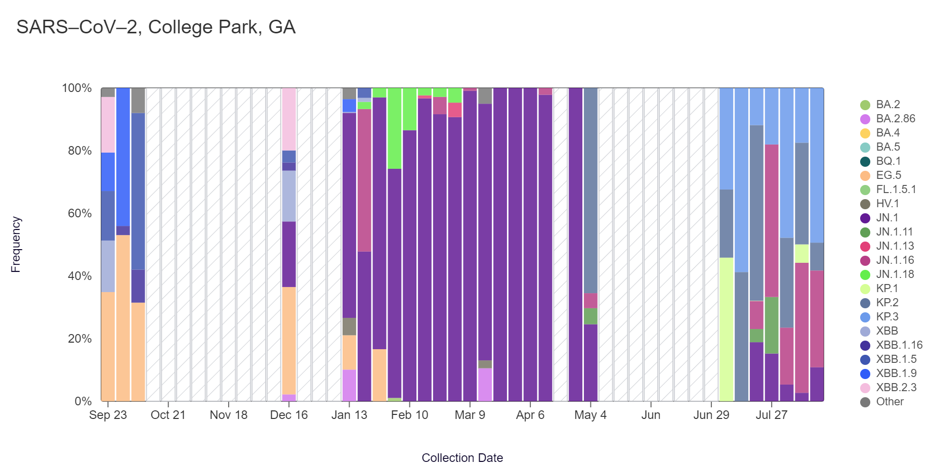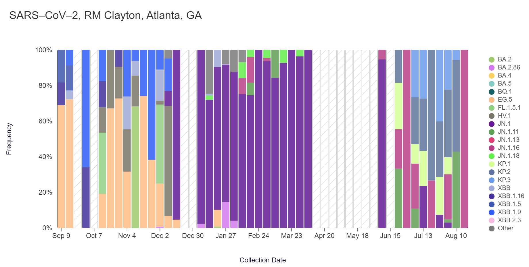 In the most recent samples, JN.1.16 (100%) made up the largest proportion of lineages detected at RM Clayton. KP.3 (49.4%) made up the largest proportion of lineages detected at College Park. Note that the most recent data is shown below & should be updated as more samples are analyzed (through Aug 17 at RM Clayton and College Park).