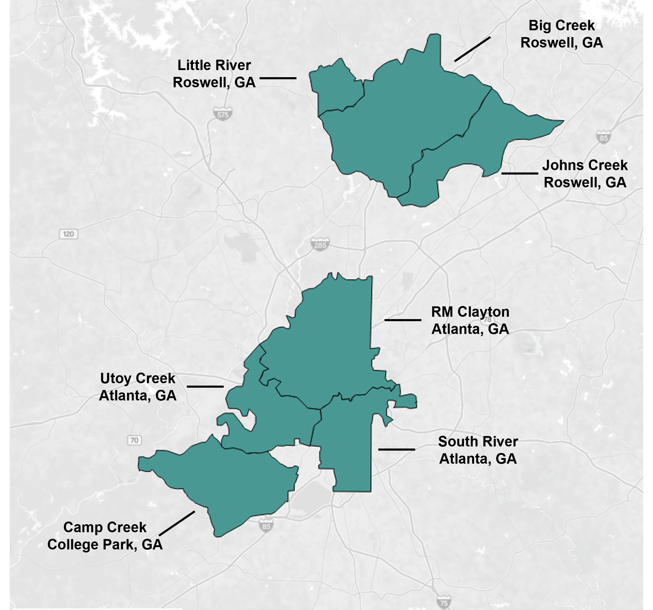 As of 10/12/23, Big Creek, Camp Creek, Johns Creek, Little River, and South River are in the HIGH (5 sites) category, Utoy Creek and RM Clayton are in the MEDIUM (2 sites) category, and Columbus is in the LOW (1 site) category.