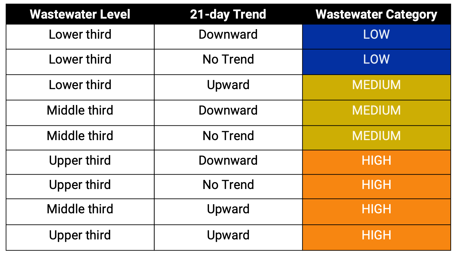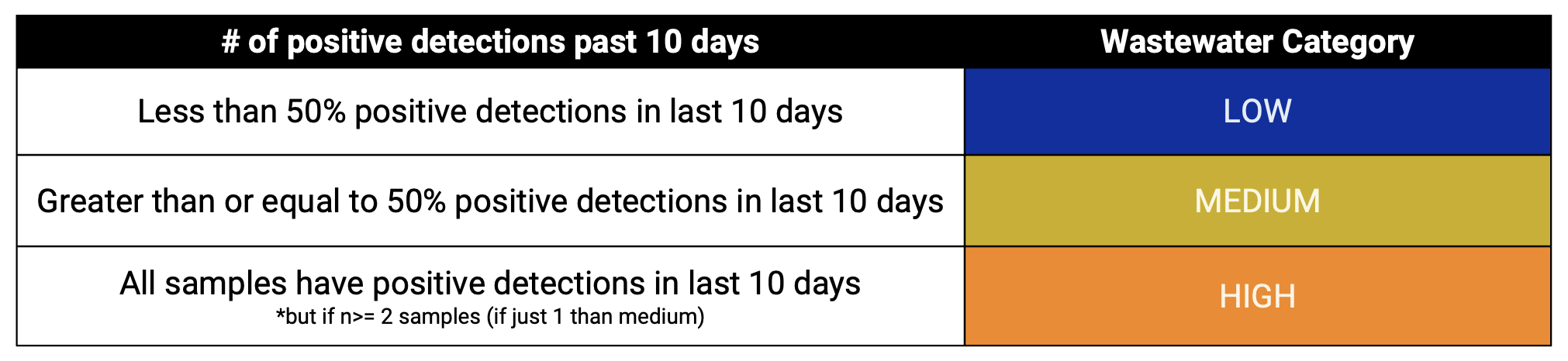 WastewaterSCAN uses a Wastewater Categorization system to communicate important insights from recent wastewater results. Research shows that the measurements we make in wastewater are related to disease in the community. The wastewater categorization helps us quickly understand if the recent measurements for a disease fall into a low, medium, or high category and are determined based on a combination of the following variables: