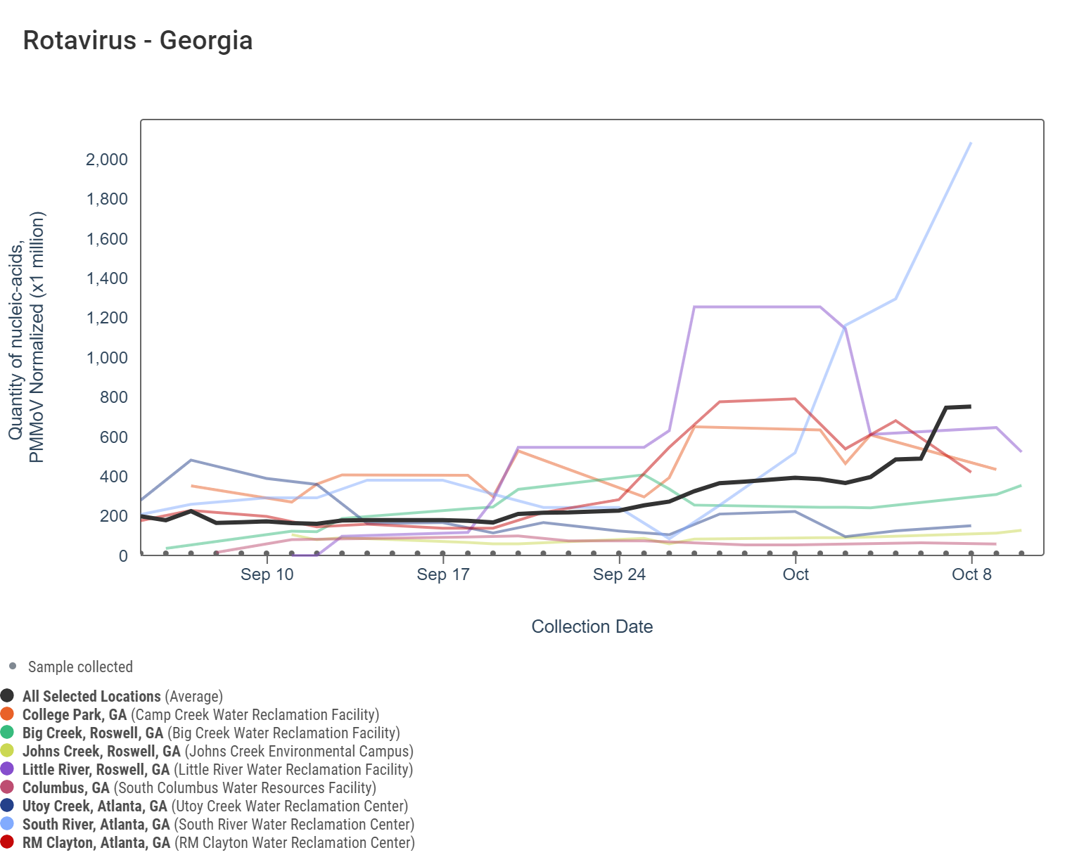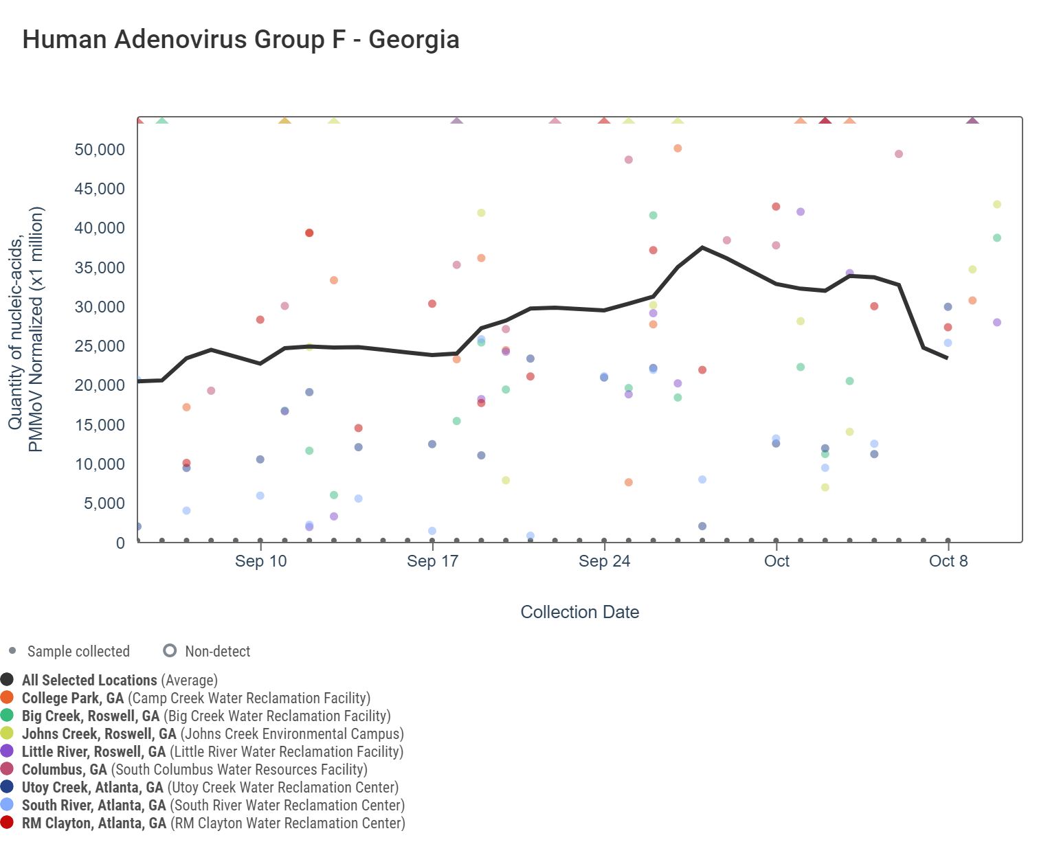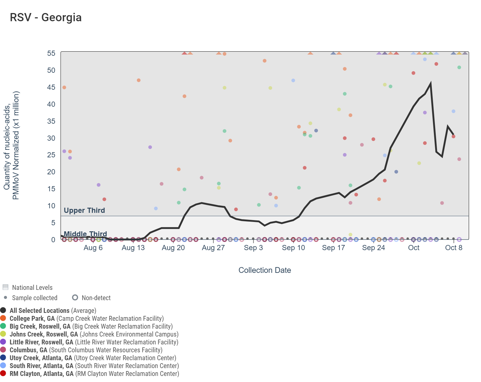 Respiratory syncytial virus (RSV) RNA concentrations are less than 80,000 copies/g. The chart below includes the raw data for each site since July plus the population-weighted average line showing that RSV RNA concentrations among the 8 Georgia sites continue to be in the upper third level of all concentrations measured in the last year. This is because there are are many measurements that are non-detect for RSV throughout the year, so consistent detections quickly reach a higher level.