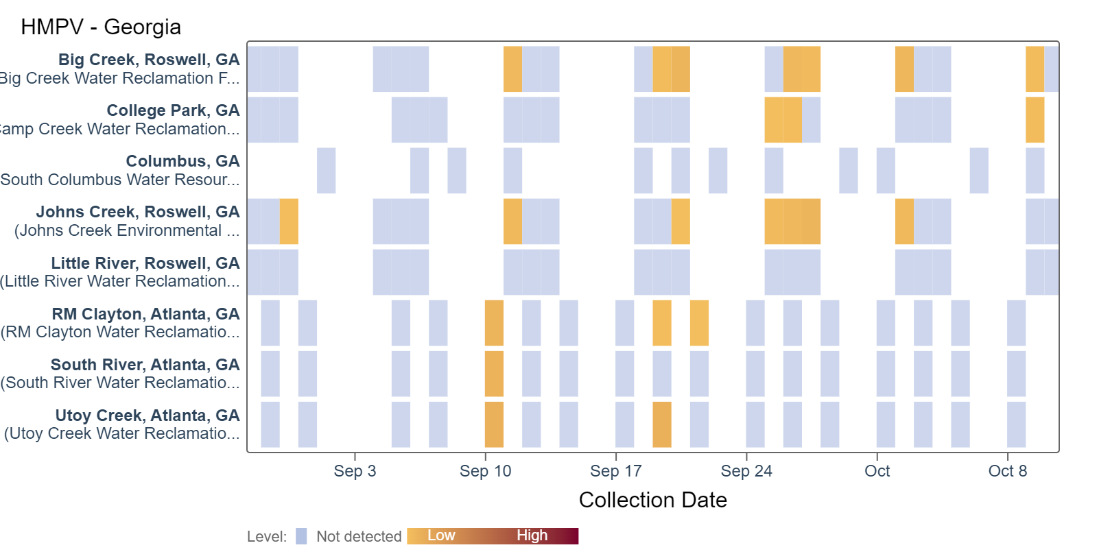 HMPV (human metapneumovirus) RNA detections are sporadic and concentrations are below 7200 copies/g. This represents a higher rate of detection than in the last several months. According to this heat map, HMPV has been more frequently detected in the last few weeks at most sites except RM Clayton, Columbus, and Little River. All 8 Georgia sites are in the LOW Wastewater Category based on sample collection through 10/12/23.