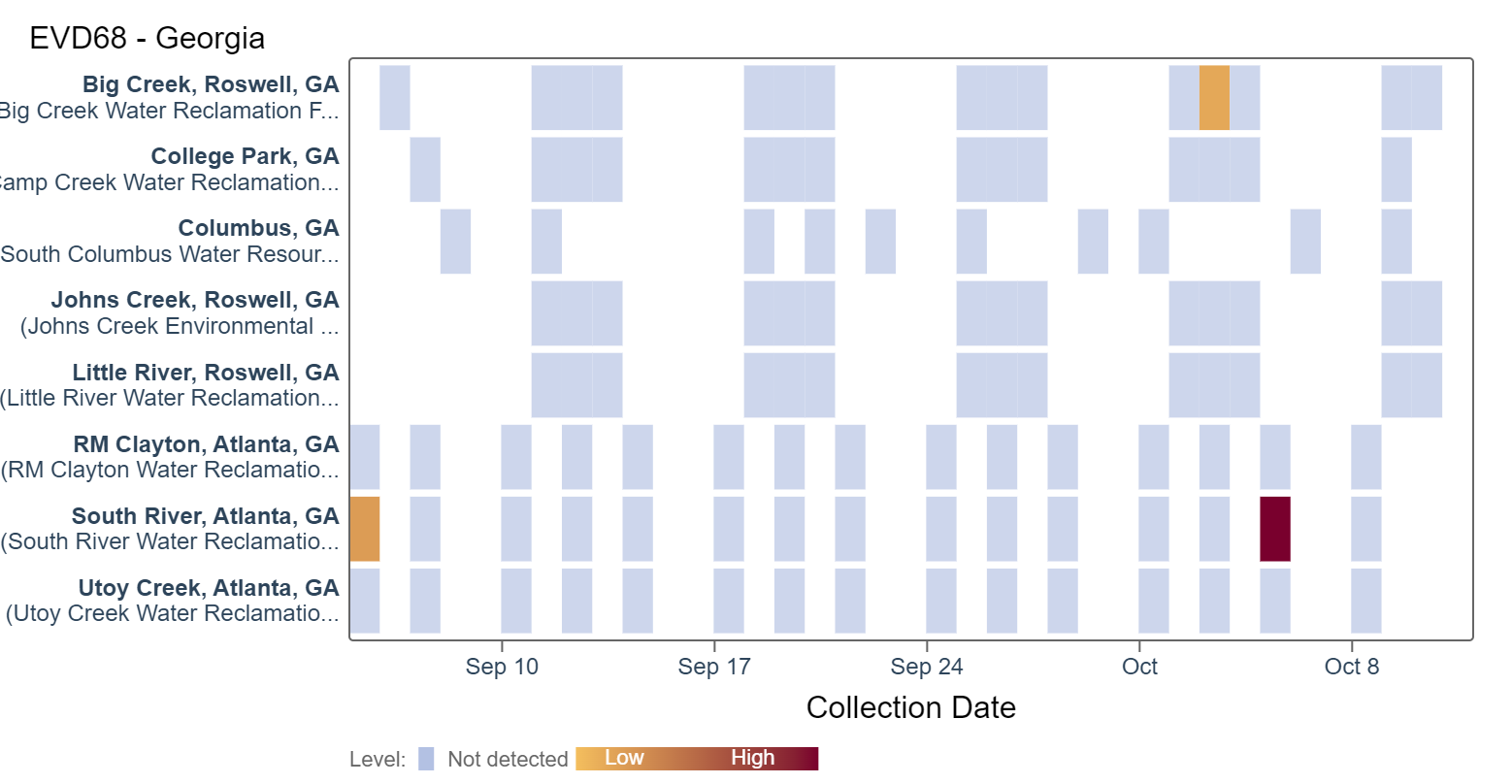 Most Georgia sites are in the MEDIUM (5 sites) Wastewater Category (Big Creek, College Park, RM Clayton, South River, and Utoy Creek) as of 10/12/23; Columbus and Johns Creek are in the HIGH (2 sites) category; and Little River is in the LOW (1 site) Wastewater Category. Norovirus in the south is currently higher than in other parts of the country.