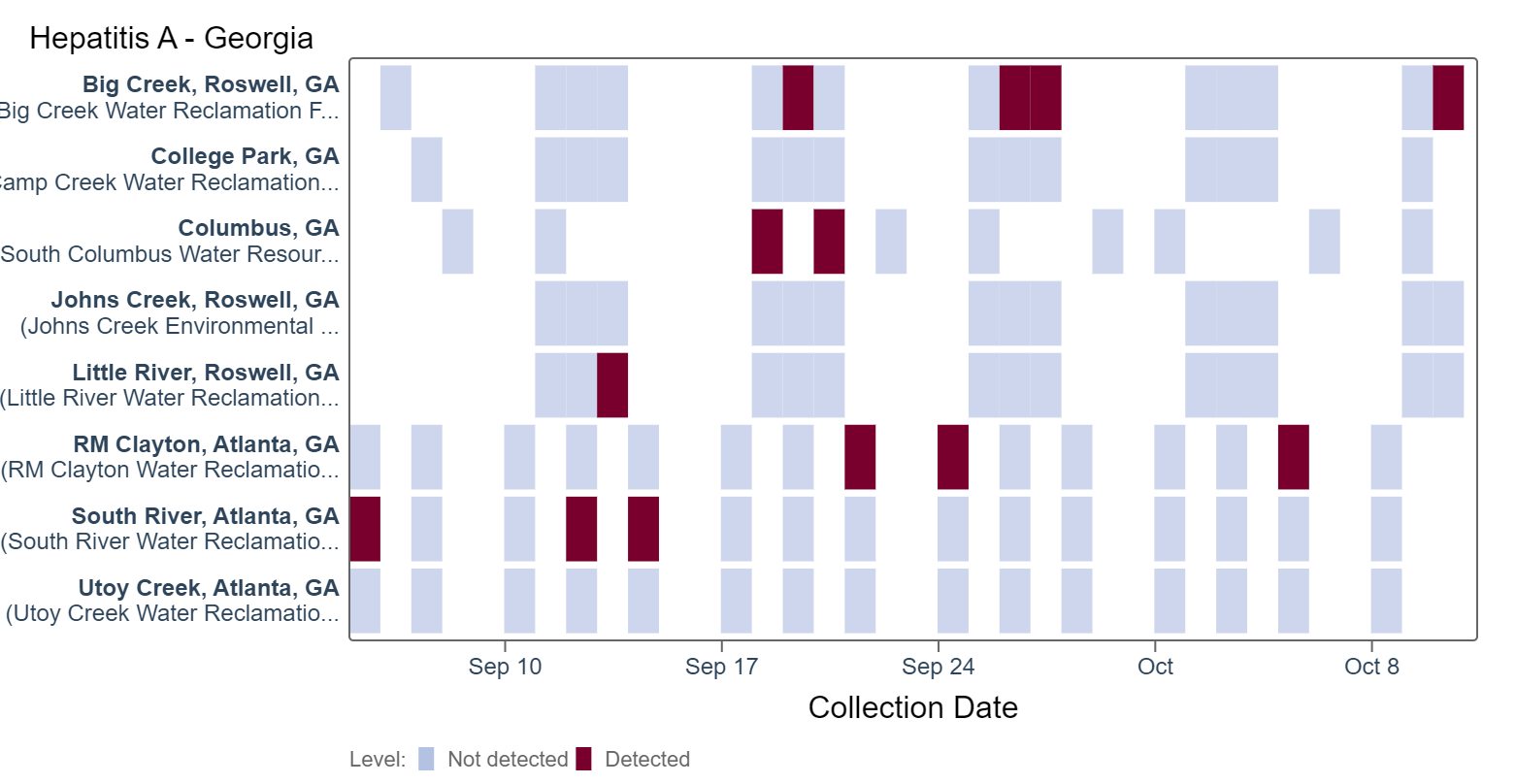 Hepatitis A RNA detection is sporadic and has been detected at most sites except College Park, Johns Creek, and Utoy Creek. This heat map shows data since September 5th, 2023. Because this is a new target, there is no category assigned and we are still establishing what an expected baseline amount of detection will be.