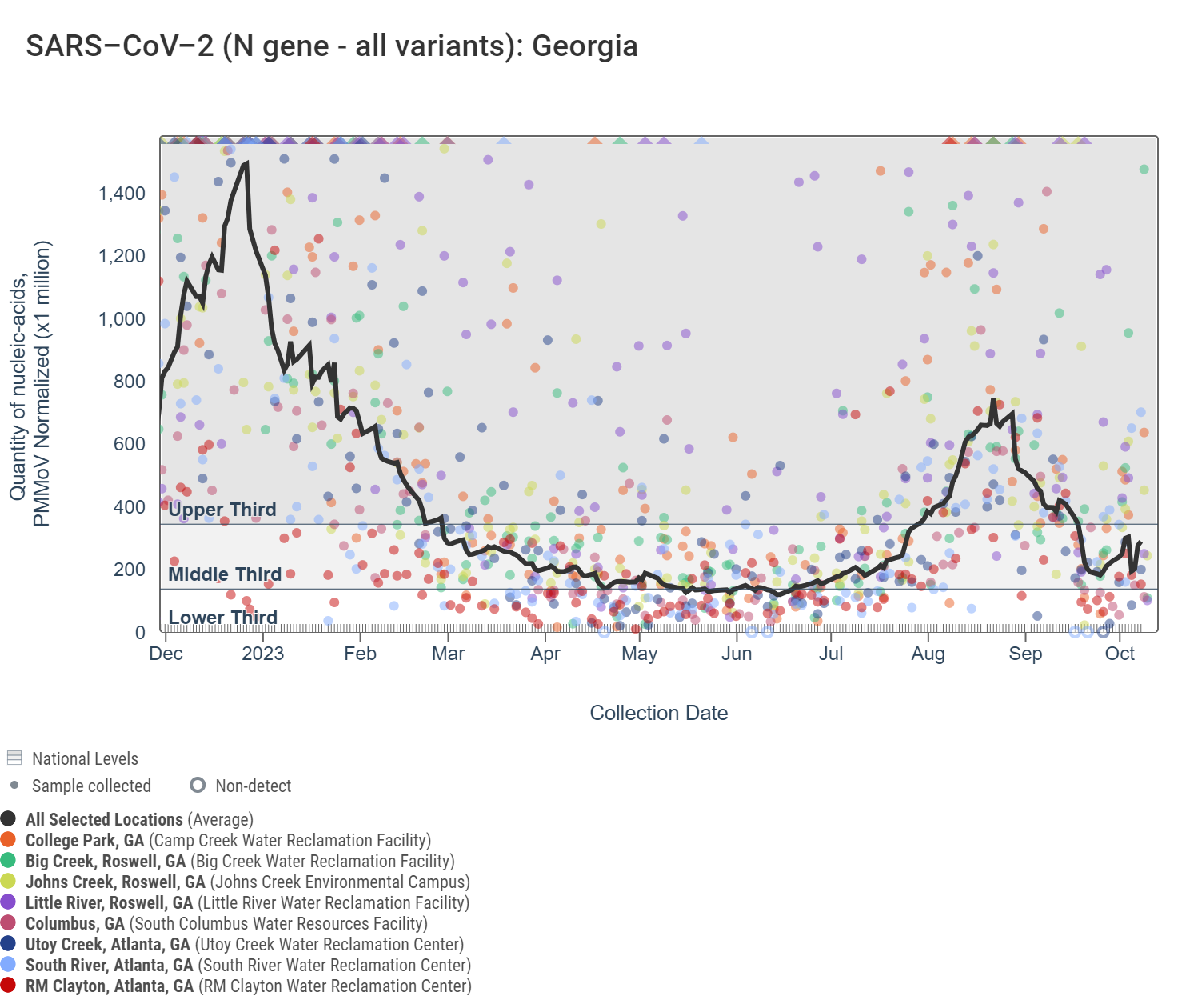 SARS-CoV-2 RNA concentrations are less than 360,000 copies per gram in the last two weeks. The chart below shows the raw data since December 2022 and the population-weighted aggregated trend line for all 8 Georgia sites when the data is normalized by PMMoV. The aggregated line and the National Levels benchmarks illustrate that SARS-CoV-2 N gene RNA concentrations among Georgia sites are within the middle third level of all concentrations measured in the last year.