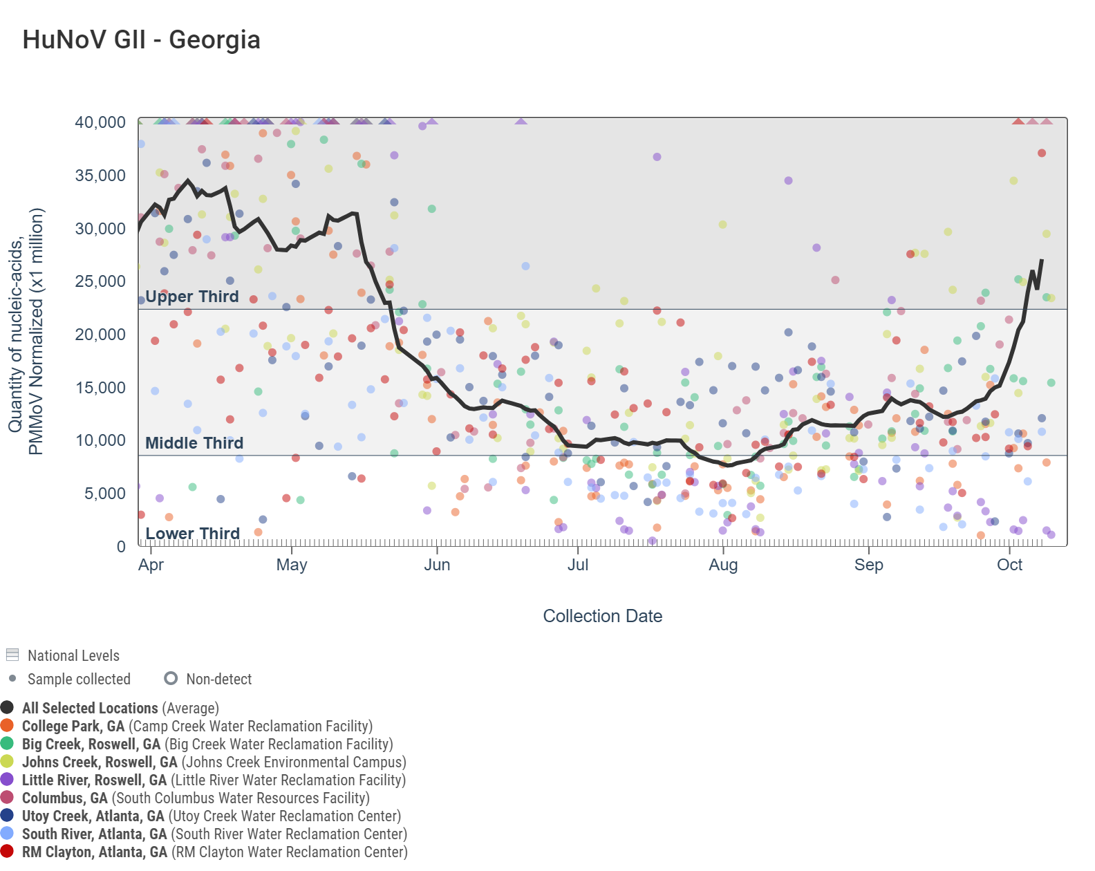 Norovirus GII (HuNoV GII) RNA concentrations have increased to range between 352,000 - 14,270,000 copies/g and the population-weighted average line for the 8 Georgia sites is within the upper third level.