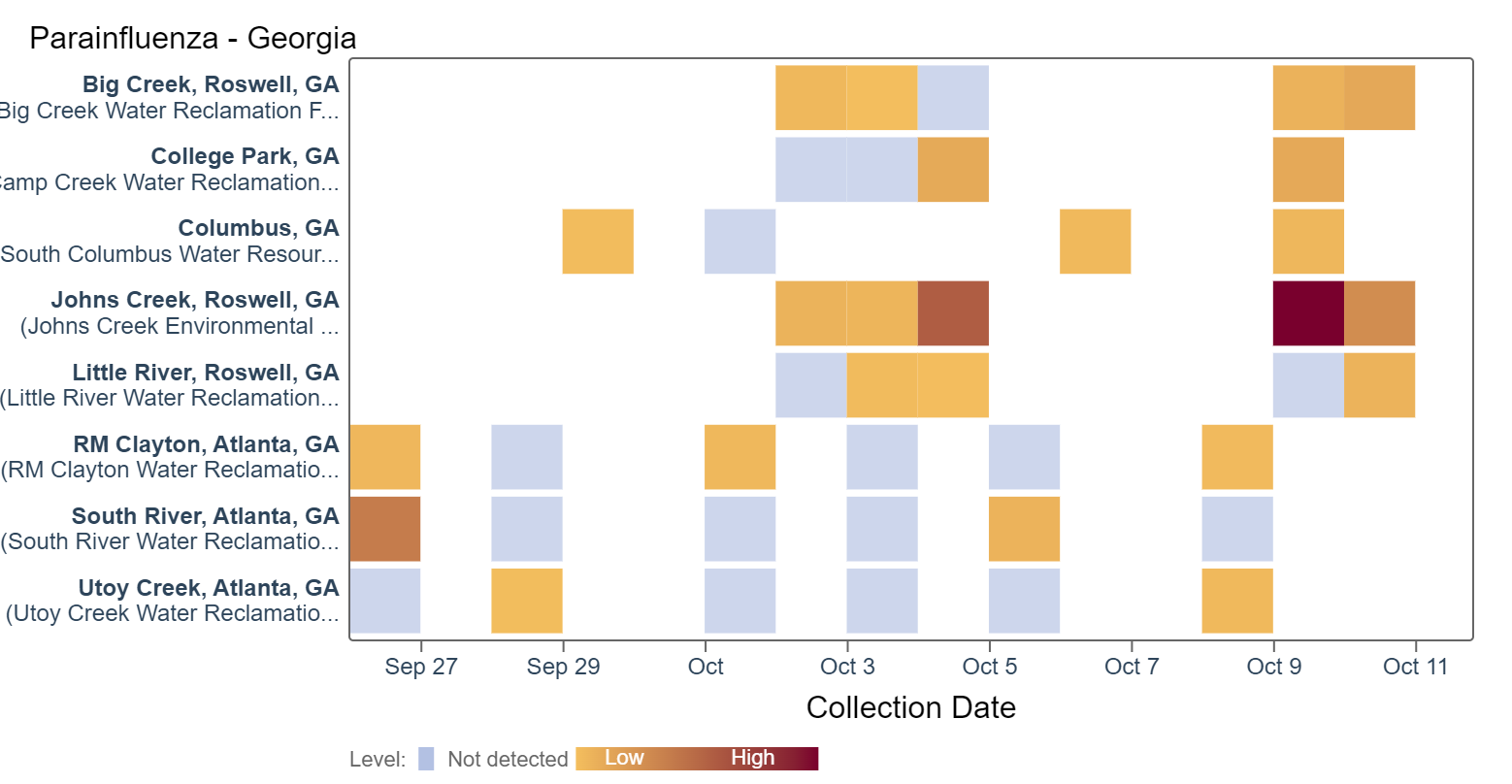 Parainfluenza RNA has been frequently detected in samples collected from most Georgia sites. Concentrations are less than 168,000 copies/g. Because this is a new target, there is no category assigned and we are still establishing what an expected baseline amount of detection will be.