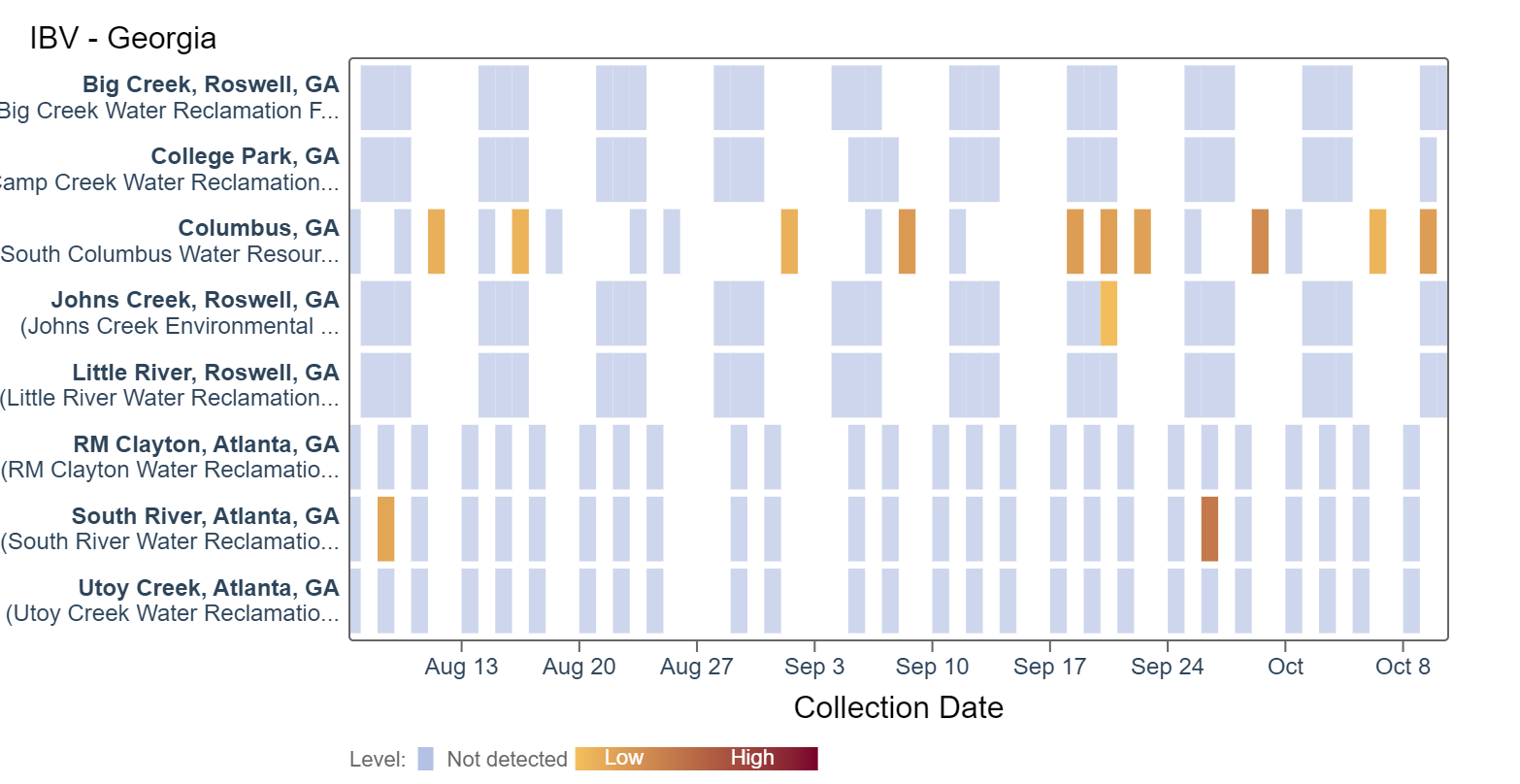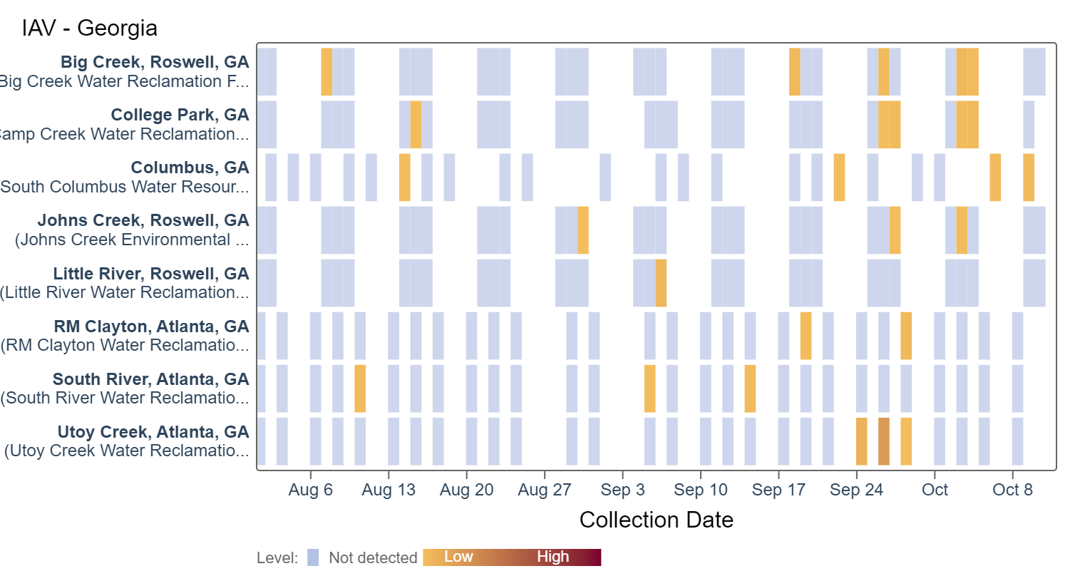 Influenza A (IAV) RNA has been detected at low concentrations at Big Creek, Columbus, and RM Clayton within the last two weeks as seen in the heat map below. This represents a higher rate of detection than in the last several months. Concentrations are less than 7500 copies/g. All 8 Georgia sites are in the LOW Wastewater Category (not in onset) based as of 10/12/23.