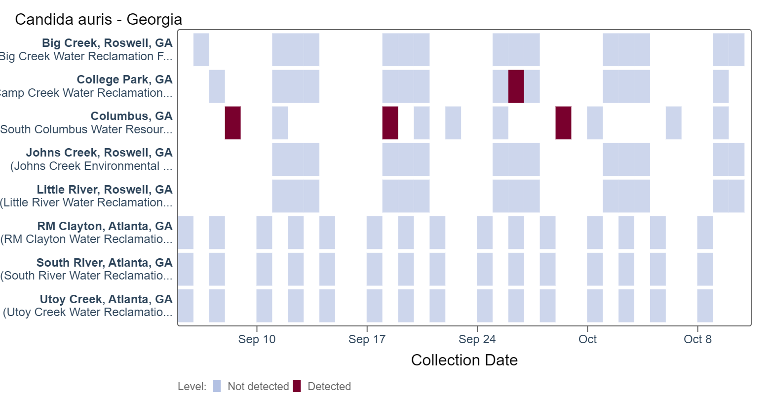 Candida auris DNA has been detected at College Park and Columbus, based on the heat map below that dates back to 09/05/2023. Because this is a new target, there is no category assigned and we are still establishing what an expected baseline amount of detection will be.