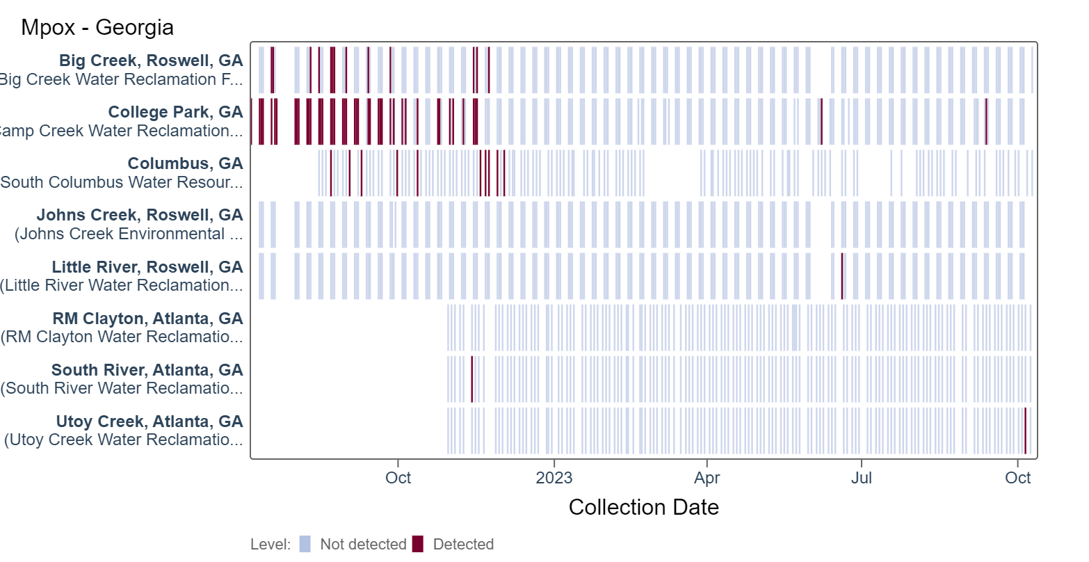Mpox DNA results have been non-detect in the last 21 days at most Georgia plants except Utoy Creek, where a single detection occurred on 10/5/2023. This heat map shows data since July 2022. Sites are labeled in the rows and each date a sample was collected as a column. The color blue means the sample was non-detect for mpox DNA and the color maroon means Mpox DNA was detected. White indicates no sample was collected. All 8 Georgia sites are in the LOW Wastewater Category based on sample collection through 10/12/23.