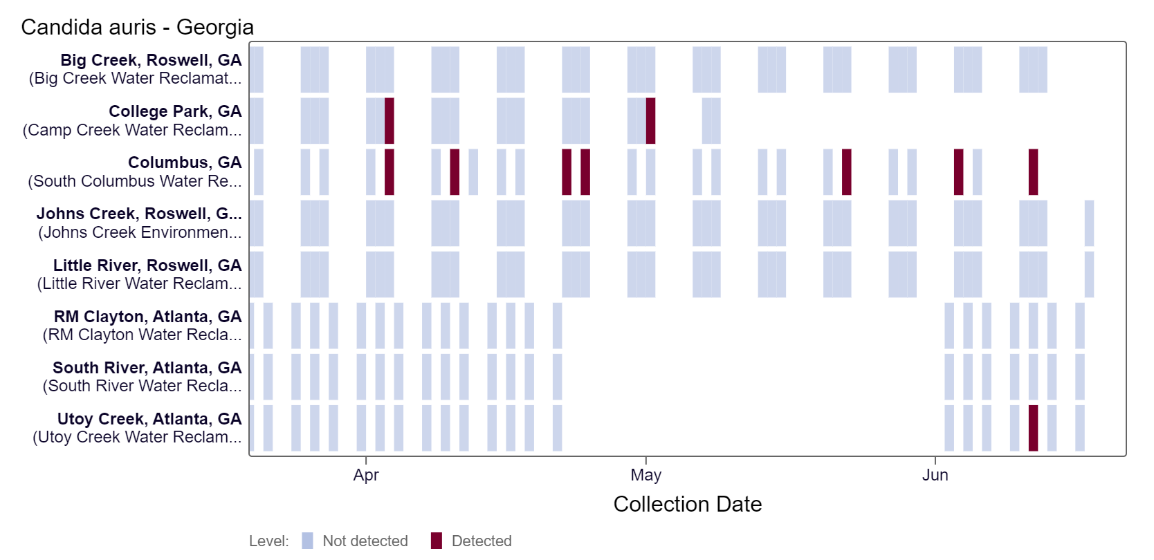 Candida auris DNA has been detected both the Columbus and Utoy Creek sites in the last two weeks, based on the heat map below. The highest C. auris DNA concentrations were detected at the Columbus site and below 2,600 copies/g. As of 6/21/24, RM Clayton, South River, Utoy Creek, Johns Creek, and Little River are in the LOW (5 sites) wastewater category. There was not enough data to calculate a category for Columbus, College Park, and Big Creek.