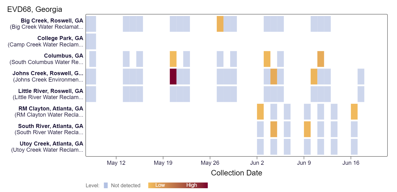EV-D68 RNA has been detected at South River, Johns Creek, Columbus and RM Clayton sites over the last couple weeks, according to the heat map below. As a reminder, the color blue means the sample was non-detect for EV-D68 RNA and the colors get darker with higher concentrations. As of 6/21/24, RM Clayton, South River, Utoy Creek, Johns Creek, and Little River are in the LOW (5 sites) wastewater category. There was not enough data to calculate a category for Columbus, College Park, and Big Creek.