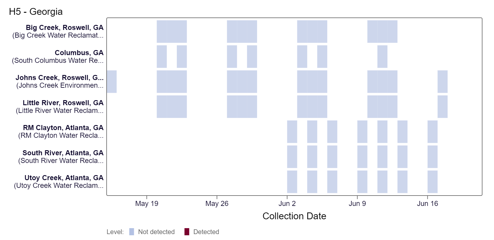 Beginning May 15th, we expanded prospective H5 marker testing to all WastewaterSCAN sites. Below is a heat map showing the Georgia sites with samples collected tested thus far. Over the last few weeks, results have been non-detect at all Georgia sites with data available. For more information about this testing and interpretation of results, see our FAQ sheet here.