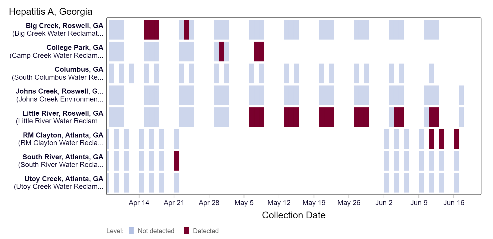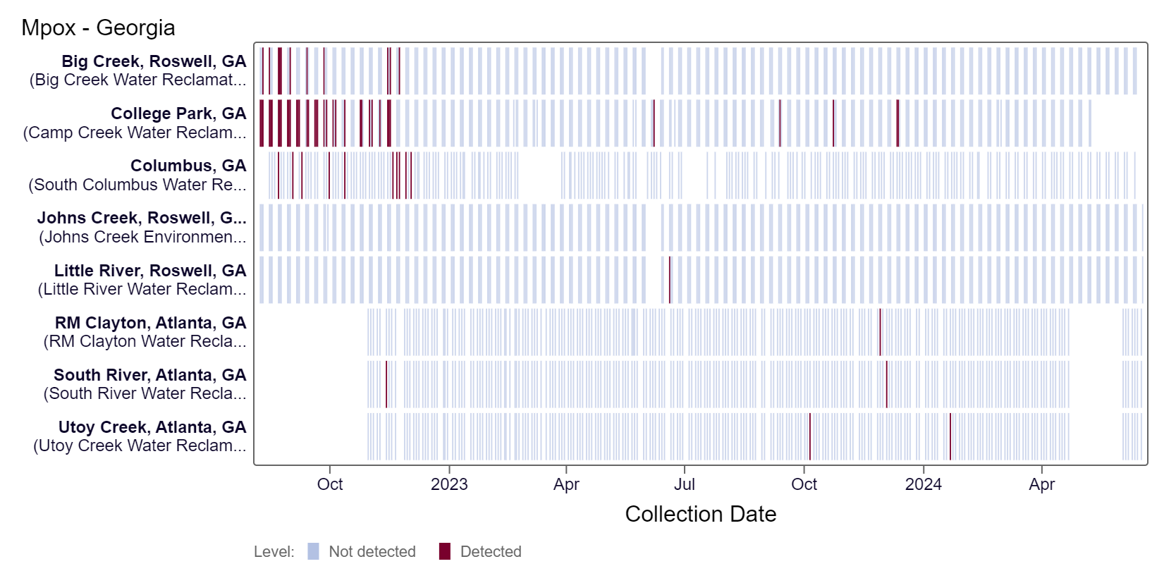 Mpox DNA results have been non-detect at all Georgia sites in the last 21 days. This heat map shows data since July 2022. Sites are labeled in the rows and each date a sample was collected as a column. The color blue means the sample was non-detect for mpox DNA and the color maroon means Mpox DNA was detected. White indicates no sample was collected. RM Clayton, South River, Utoy Creek, Johns Creek, and Little River are in the LOW (5 sites) wastewater category as of 6/21/24. There was not enough data to calculate a category for Columbus, College Park, and Big Creek.