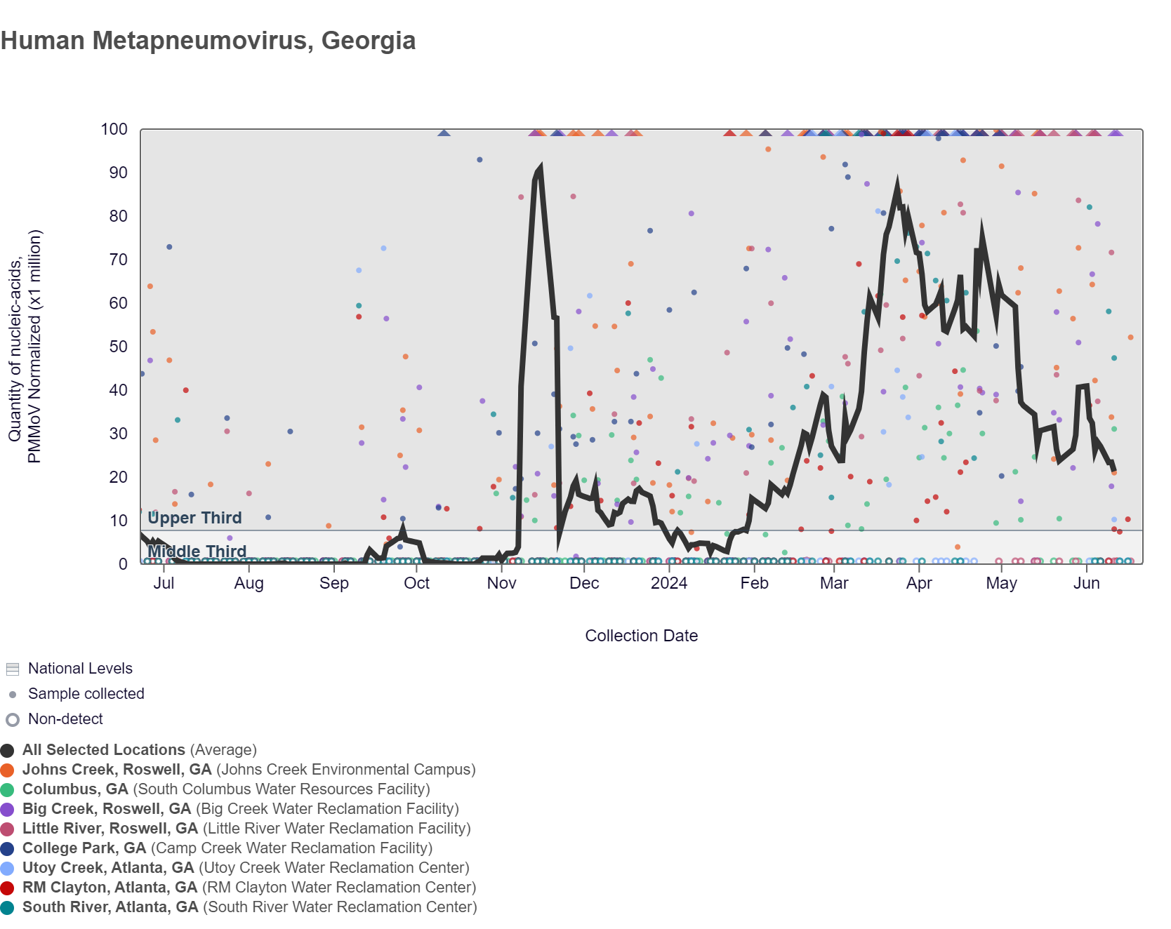HMPV (human metapneumovirus) RNA concentrations in wastewater are below 46,000 copies/g. HMPV RNA concentrations in Georgia are within the upper third level of all concentrations measured in the last year. RM Clayton & Johns Creek are in the HIGH (2 sites) wastewater category, as of 6/21/24. But Little River, South River, and Utoy Creek are in the LOW (3 sites) wastewater category. There was not enough data to calculate a category for Columbus, College Park, and Big Creek. Nationally and in the South, HMPV is in the "Low" category and currently not in onset.