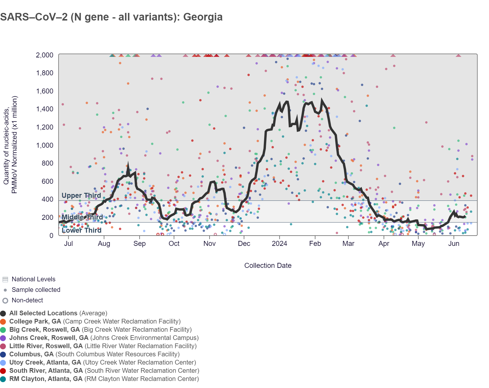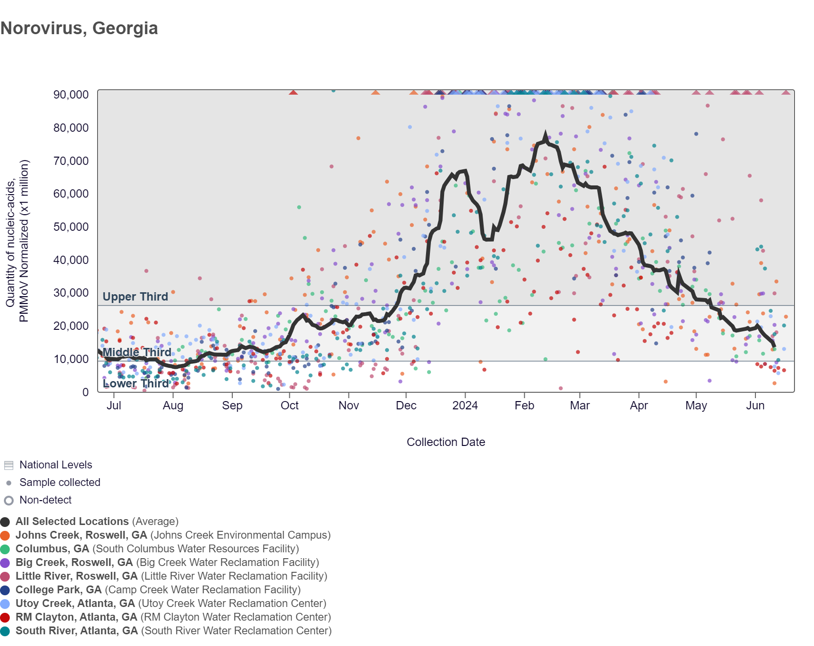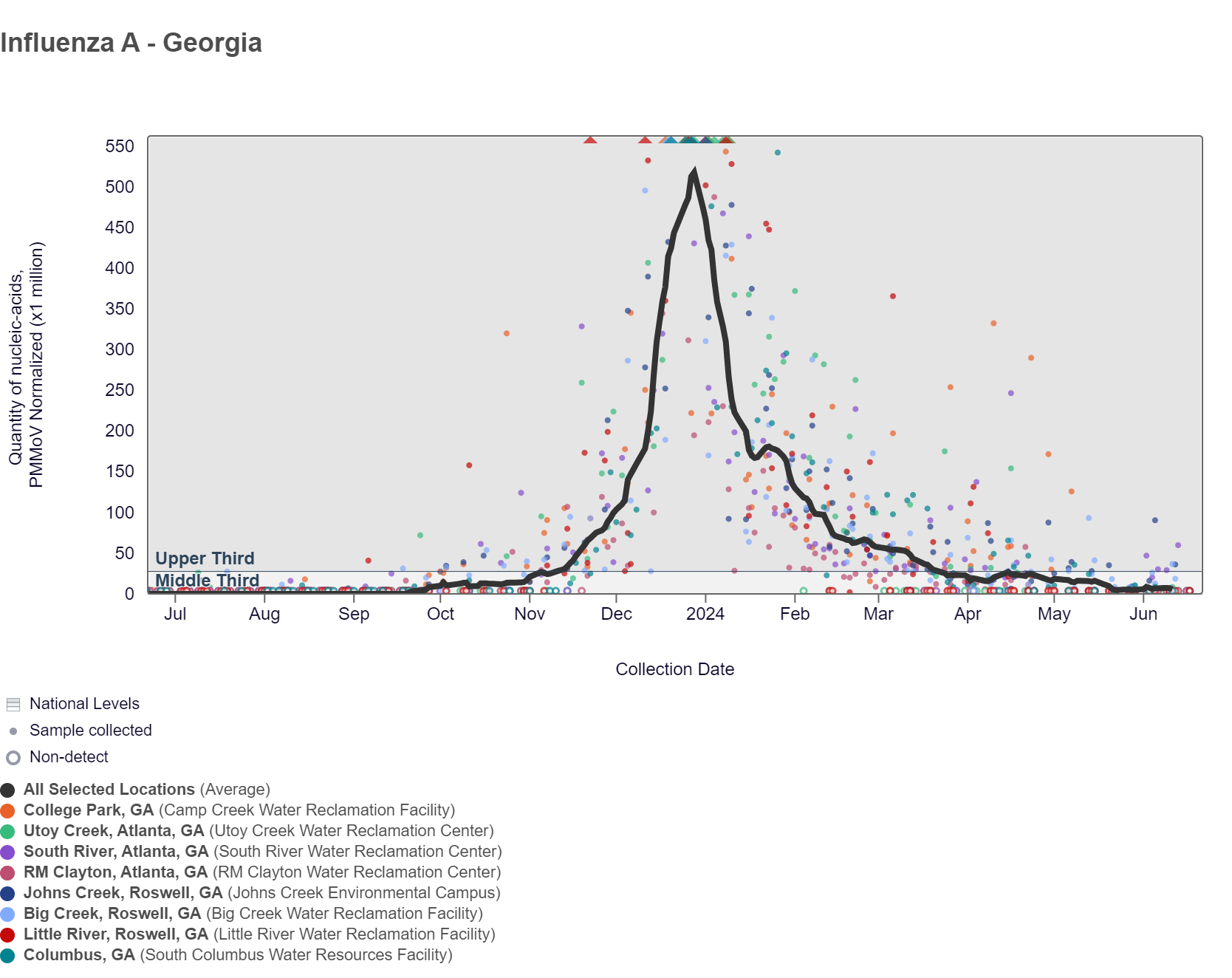Influenza A (IAV) RNA concentrations have been below 6,100 copies/gram in the last two weeks. The chart below shows the raw data and the population-weighted aggregated trend line for all 8 Georgia sites when the data is normalized by PMMoV is in the middle third level. As of 6/21/24, RM Clayton, South River, Utoy Creek, Johns Creek, and Little River are in the LOW (5 sites) wastewater category. There was not enough data to calculate a category for Columbus, College Park, and Big Creek.