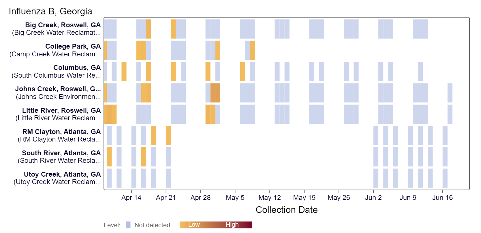 Influenza B (IBV) RNA has not been detected at any Georgia site within the last two weeks, according to the heat map below.