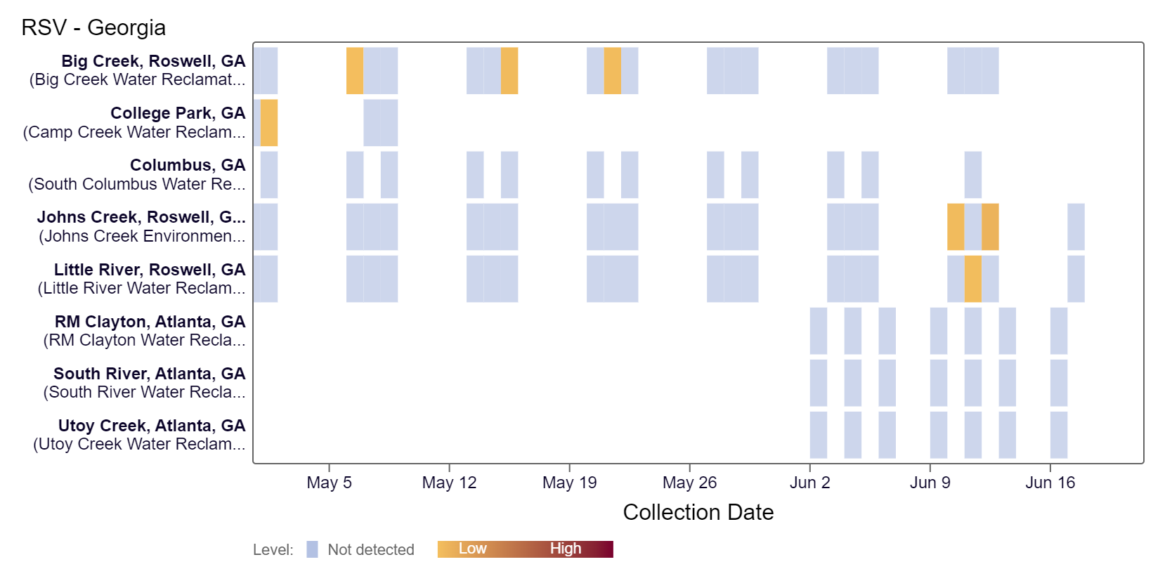 Respiratory syncytial virus (RSV) RNA has been detected at the Johns Creek and Little River sites over the last two weeks, according to the heat map below. At the Johns Creek site, RSV was detected at the higher concentrations below 6,300 copies/g. Creek site In the Southern region, RSV remains in the "Low" category and not in onset.