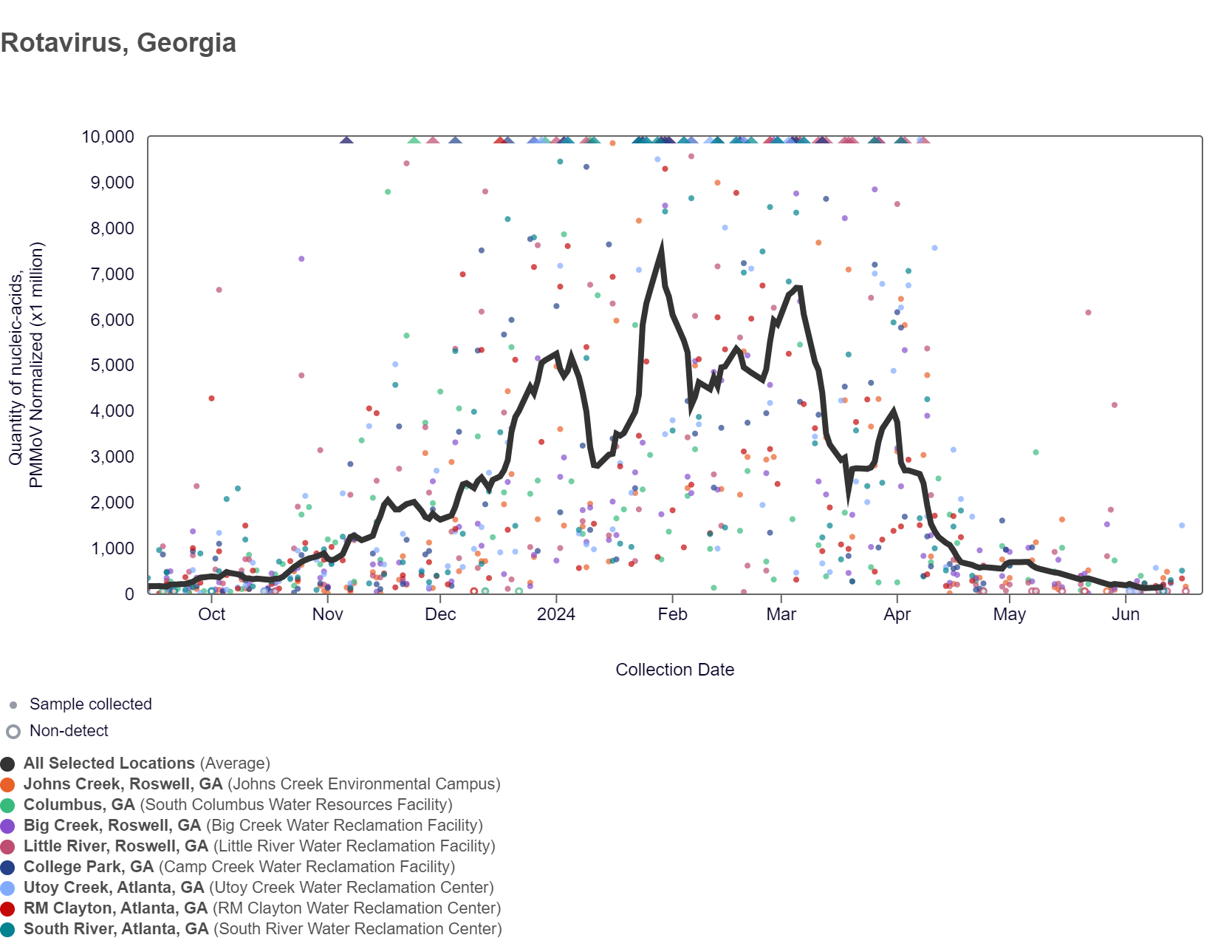 Rotavirus RNA concentrations have been below 216,000 copies/g over the last two weeks. The chart below shows the population-weighted average line is shown in black plus the raw data for each site. As of 6/21/24, RM Clayton and Utoy Creek are in the HIGH (2 sites) wastewater category. South River and Johns Creek are in the MEDIUM (2 sites) wastewater category. Little River is in the LOW (1 site) wastewater category. There was not enough data to calculate a category for Columbus, College Park, and Big Creek.