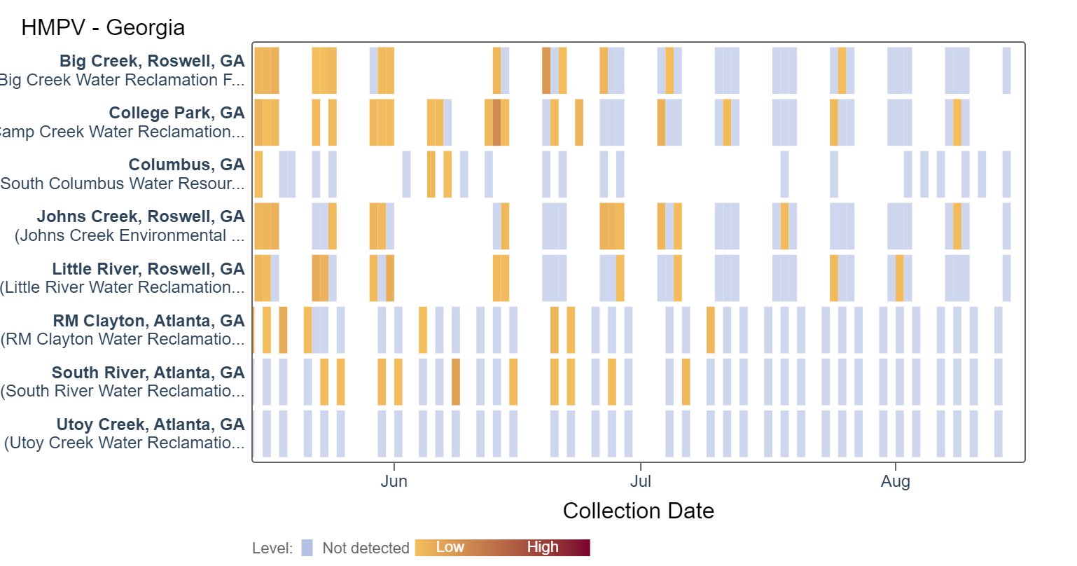 HMPV (human metapneumovirus) RNA concentrations are currently in the lower third level. According to the heat map, HMPV RNA has sporadically been detected at mainly lower concentrations. An analysis of HMPV RNA concentrations showed there is no trend across Georgia sites.