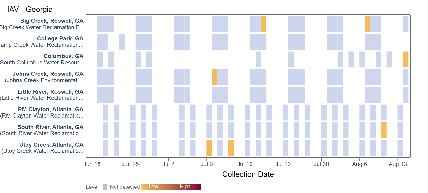 Influenza A (IAV) RNA has been rarely detected in the last two weeks. Based on the heat map below, some sites have not detected IAV in over a month. An analysis of IAV RNA concentrations showed there is no trend across Georgia sites.