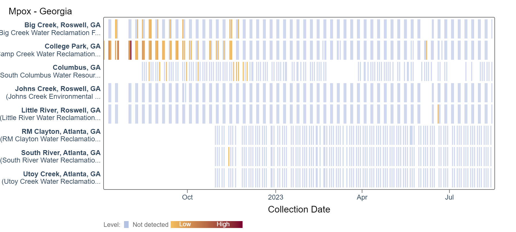 Results are non-detect for mpox for the past 21 days at Georgia plants. This heat map shows data since July 2022. Sites are labeled in the rows and each date a sample was collected as a column. The color blue means the sample was non-detect for mpox DNA and the colors get darker with higher concentrations.