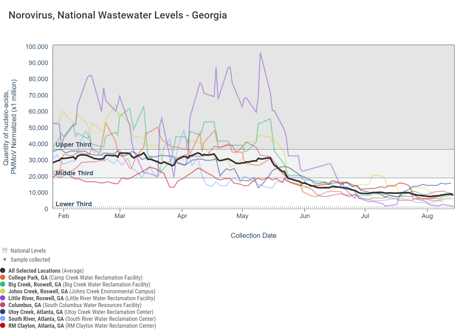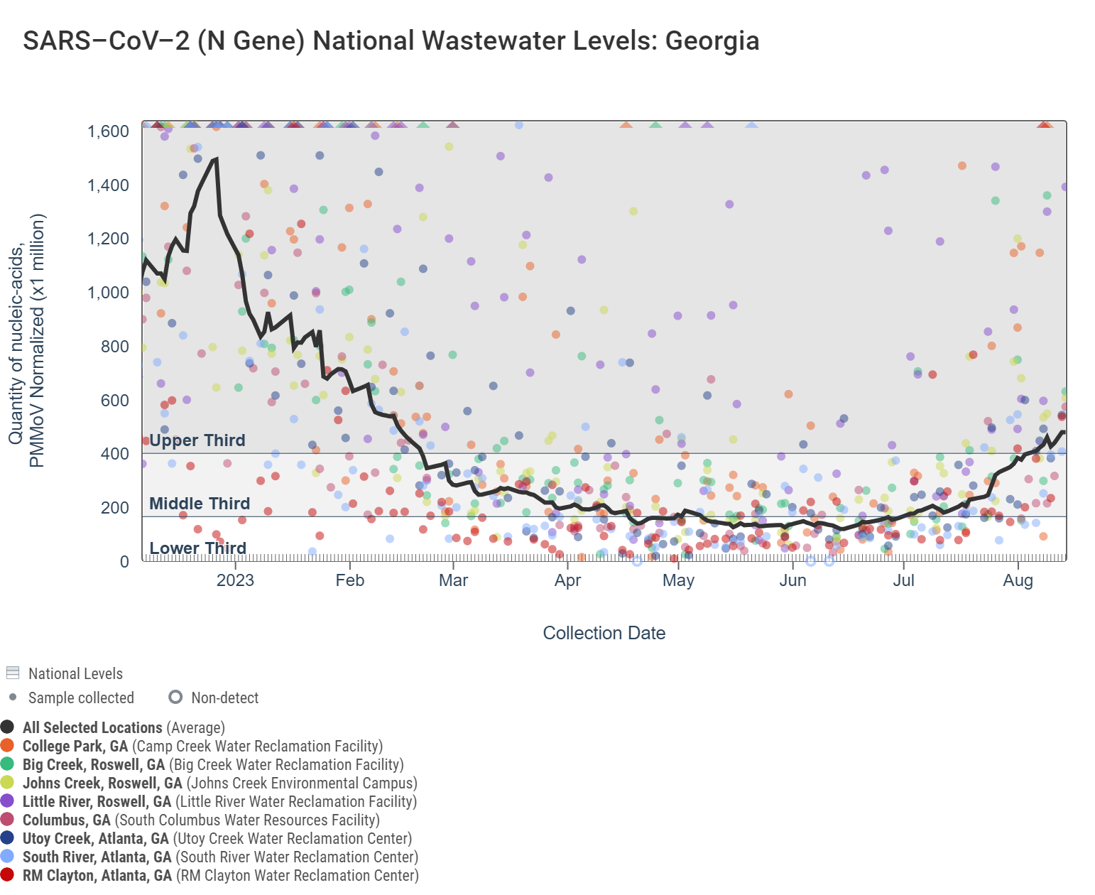 The dark gray line in each chart is a population-weighted aggregated trend line for all 8 Georgia sites when the data is normalized by PMMoV. "National levels" visually benchmark where concentrations fall compared to previously recorded measurements for each pathogen. The aggregated line in the chart below shows that SARS-CoV-2 N gene RNA concentrations are now within the upper third level of all concentrations measured in the last year. Additional information on the methodology behind this trend line is available here in the "How are aggregated trendlines determined?" section. More details can be found under the "How are national levels determined?" section here.