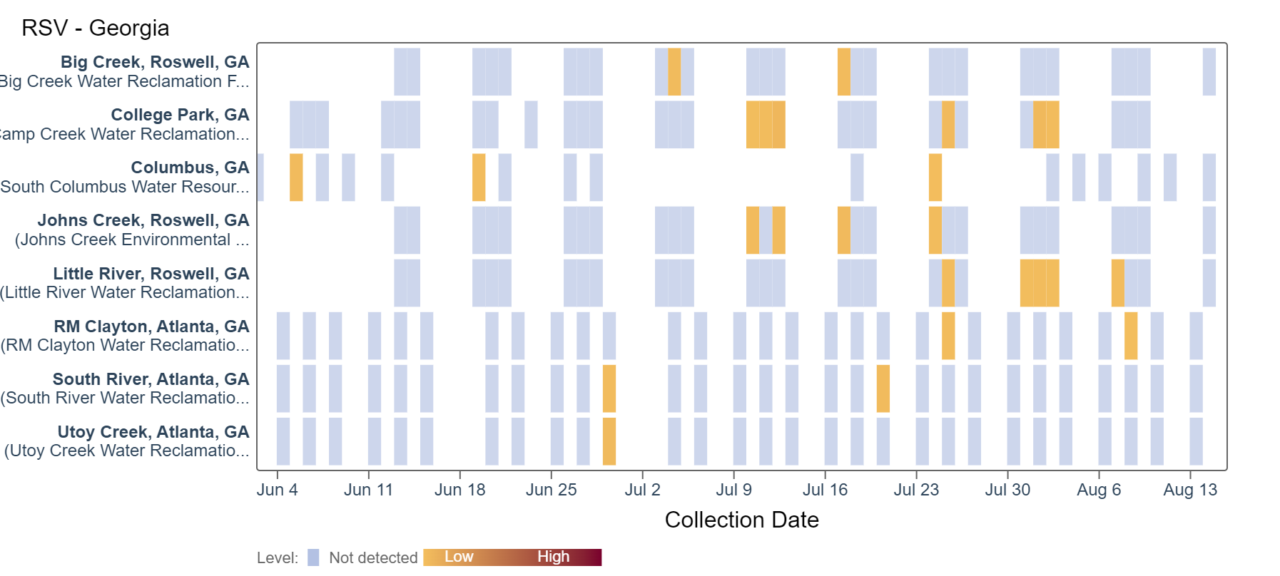 RSV RNA detection continues to be sporadic at low concentrations at some sites. Big Creek, Columbus, Johns Creek, South River, and Utoy Creek did not detect RSV in samples collected over the past two weeks. An analysis of RSV RNA concentrations showed there is no trend across Georgia sites.